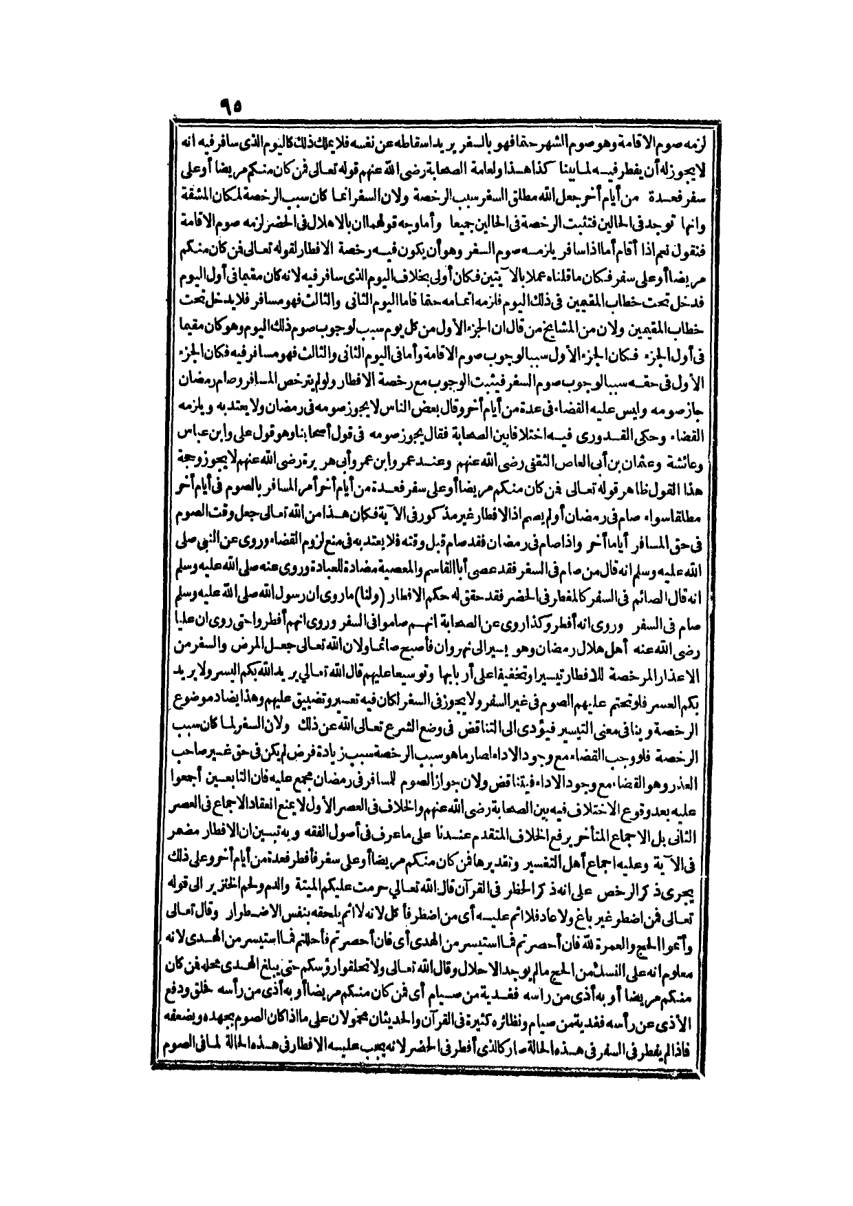 وَأَمَّا فِي الْيَوْمِ الثَّانِي، وَالثَّالِثِ فَهُوَ مُسَافِرٌ فِيهِ فَكَانَ الْجُزْءُ الْأَوَّلُ فِي حَقِّهِ سَبَبًا لِوُجُوبِ صَوْمِ السَّفَرِ فَيَثْبُتُ الْوُجُوبُ مَعَ رُخْصَةِ الْإِفْطَارِ وَلَوْ لَمْ يَتَرَخَّصْ الْمُسَافِرُ وَصَامَ رَمَضَانَ جَازَ صَوْمُهُ وَلَيْسَ عَلَيْهِ الْقَضَاءُ فِي عِدَّةِ أَيَّامٍ أُخَرَ، وَقَالَ بَعْضُ النَّاسِ: لَا يَجُوزُ صَوْمُهُ فِي رَمَضَانَ وَلَا يُعْتَدُّ بِهِ وَيَلْزَمُهُ الْقَضَاءُ، وَحَكَى الْقُدُورِيُّ فِيهِ اخْتِلَافًا بَيْنَ الصَّحَابَةِ فَقَالَ: يَجُوزُ صَوْمُهُ فِي قَوْلِ أَصْحَابِنَا وَهُوَ قَوْلُ عَلِيٍّ وَابْنِ عَبَّاسِ وَعَائِشَةَ وَعُثْمَانَ بْنِ أَبِي الْعَاصِ الثَّقَفِيِّ - رَضِيَ اللَّهُ عَنْهُمْ - وَعِنْدَ عُمَرَ وَابْنِ عُمَرَ وَأَبِي هُرَيْرَةَ - رَضِيَ اللَّهُ عَنْهُمْ - لَا يَجُوزُ، وَحُجَّةُ هَذَا الْقَوْلِ ظَاهِرُ قَوْله تَعَالَى {فَمَنْ كَانَ مِنْكُمْ مَرِيضًا أَوْ عَلَى سَفَرٍ فَعِدَّةٌ مِنْ أَيَّامٍ أُخَرَ} [البقرة: 184] أَمَرَ الْمُسَافِرَ بِالصَّوْمِ فِي أَيَّامٍ أُخَرَ مُطْلَقًا، سَوَاءٌ صَامَ فِي رَمَضَانَ، أَوْ لَمْ يَصُمْ إذْ الْإِفْطَارُ غَيْرُ مَذْكُورٍ فِي الْآيَةِ، فَكَانَ هَذَا مِنْ اللَّهِ تَعَالَى جَعَلَ وَقْتَ الصَّوْمِ فِي حَقِّ الْمُسَافِرِ أَيَّامًا أُخَرَ وَإِذَا صَامَ فِي رَمَضَانَ فَقَدْ صَامَ قَبْلَ وَقْتِهِ فَلَا يُعْتَدُّ بِهِ فِي مَنْعِ لُزُومِ الْقَضَاءِ.