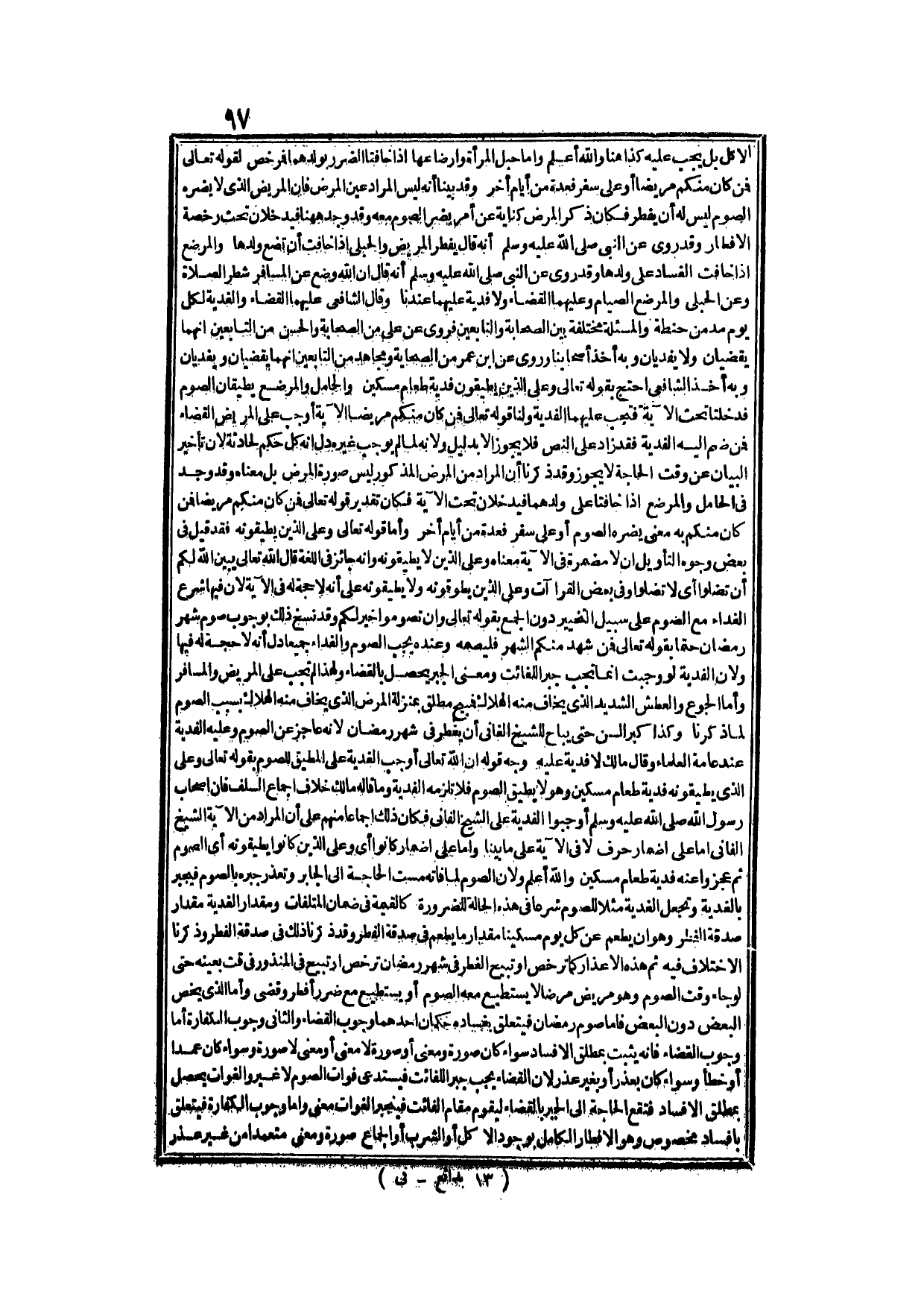 وَقَدْ وُجِدَ فِي الْحَامِلِ، وَالْمُرْضِعِ إذَا خَافَتَا عَلَى وَلَدِهِمَا فَيَدْخُلَانِ تَحْتَ الْآيَةِ، فَكَانَ تَقْدِيرُ قَوْله تَعَالَى {فَمَنْ كَانَ مِنْكُمْ مَرِيضًا} [البقرة: 184] فَمَنْ كَانَ مِنْكُمْ بِهِ مَعْنًى يَضُرُّهُ الصَّوْمُ أَوْ عَلَى سَفَرٍ فَعِدَّةٌ مِنْ أَيَّامٍ أُخَرَ، وَأَمَّا قَوْله تَعَالَى {وَعَلَى الَّذِينَ يُطِيقُونَهُ} [البقرة: 184] فَقَدْ قِيلَ فِي بَعْضِ وُجُوهِ التَّأْوِيلِ إنَّ لَا مُضْمَرَةٌ فِي الْآيَةِ مَعْنَاهُ " وَعَلَى الَّذِينَ لَا يُطِيقُونَهُ، وَإِنَّهُ جَائِزٌ فِي اللُّغَةِ، قَالَ اللَّهُ تَعَالَى: {يُبَيِّنُ اللَّهُ لَكُمْ أَنْ تَضِلُّوا} [النساء: 176] أَيْ: لَا تَضِلُّوا فِي بَعْضِ الْقِرَاءَاتِ وَعَلَى الَّذِينَ يُطَوَّقُونَهُ وَلَا يُطِيقُونَهُ عَلَى أَنَّهُ لَا حُجَّةَ لَهُ فِي الْآيَةِ لِأَنَّ فِيهَا شَرْعُ الْفِدَاءِ مَعَ الصَّوْمِ عَلَى سَبِيلِ التَّخْيِيرِ دُونَ الْجَمْعِ بِقَوْلِهِ تَعَالَى {وَأَنْ تَصُومُوا خَيْرٌ لَكُمْ} [البقرة: 184] وَقَدْ نُسِخَ ذَلِكَ بِوُجُوبِ صَوْمِ شَهْرِ رَمَضَانَ حَتْمًا بِقَوْلِهِ تَعَالَى {فَمَنْ شَهِدَ مِنْكُمُ الشَّهْرَ فَلْيَصُمْهُ} [البقرة: 185] وَعِنْدَهُ يَجِبُ الصَّوْمُ، وَالْفِدَاءُ جَمِيعًا دَلَّ أَنَّهُ لَا حُجَّةَ لَهُ فِيهَا وَلِأَنَّ الْفِدْيَةَ لَوْ وَجَبَتْ إنَّمَا تَجِبُ جَبْرًا لِلْفَائِتِ، وَمَعْنَى الْجَبْرِ يَحْصُلُ بِالْقَضَاءِ، وَلِهَذَا لَمْ تَجِبْ عَلَى الْمَرِيضِ، وَالْمُسَافِرِ.