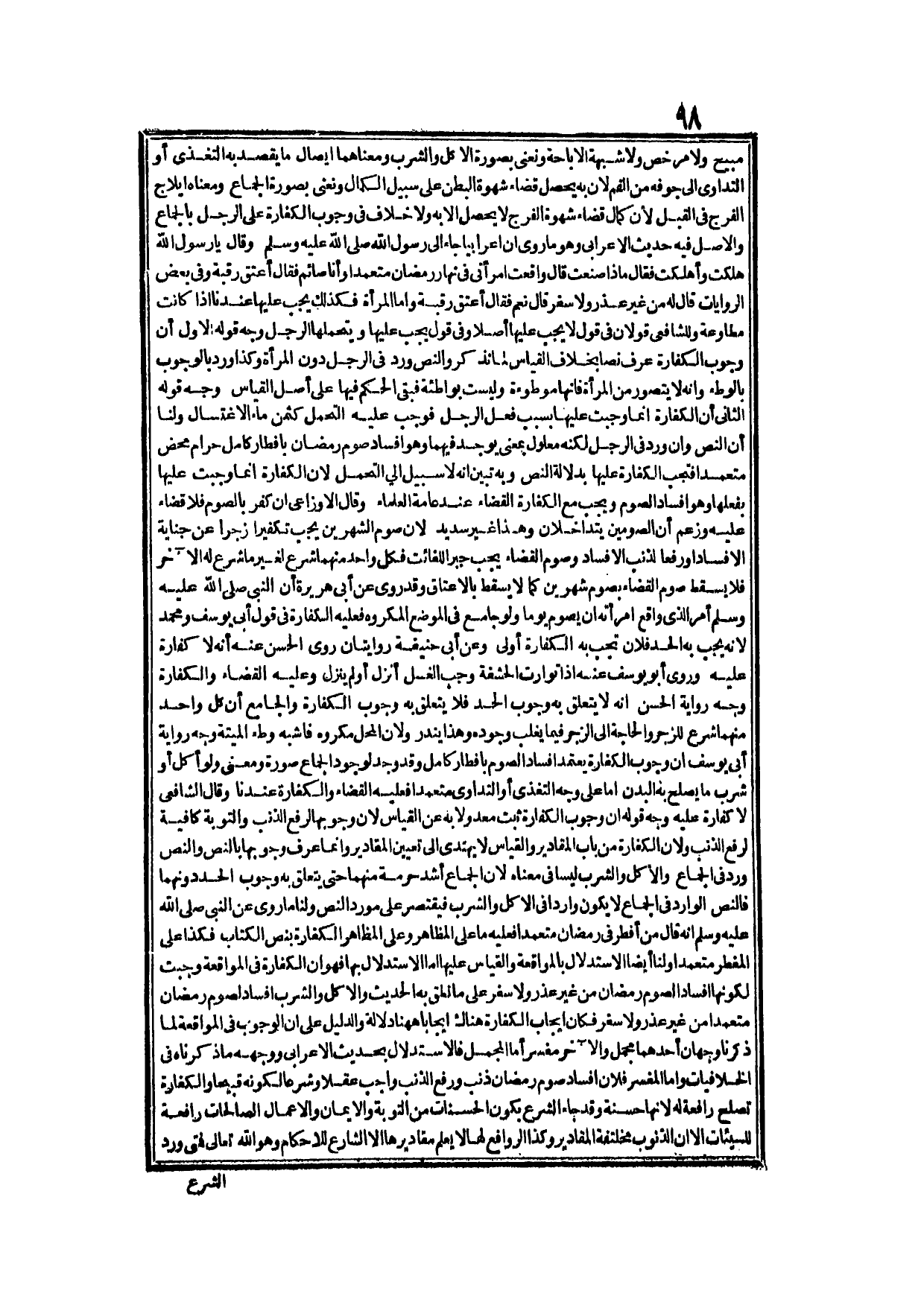 وَنَعْنِي بِصُورَةِ الْجِمَاعِ وَمَعْنَاهُ: إيلَاجَ الْفَرْجِ فِي الْقُبُلِ لِأَنَّ كَمَالَ قَضَاءِ شَهْوَةِ الْفَرْجِ لَا يَحْصُلُ إلَّا بِهِ، وَلَا خِلَافَ فِي وُجُوبِ الْكَفَّارَةِ عَلَى الرَّجُلِ بِالْجِمَاعِ، وَالْأَصْلُ فِيهِ حَدِيثُ الْأَعْرَابِيِّ وَهُوَ مَا رُوِيَ: «أَنَّ أَعْرَابِيًّا جَاءَ إلَى رَسُولِ اللَّهِ - صَلَّى اللَّهُ عَلَيْهِ وَسَلَّمَ - وَقَالَ: يَا رَسُولَ اللَّه، هَلَكْتُ، وَأَهْلَكْتُ، فَقَالَ: مَاذَا صَنَعْتَ؟ قَالَ: وَاقَعْتُ امْرَأَتِي فِي نَهَارِ رَمَضَانَ مُتَعَمِّدًا وَأَنَا صَائِمٌ فَقَالَ: أَعْتِقْ رَقَبَةً وَفِي بَعْضِ الرِّوَايَاتِ قَالَ لَهُ: مِنْ غَيْرِ عُذْرٍ وَلَا سَفَرٍ؟ قَالَ: نَعَمْ، فَقَالَ: أَعْتِقْ رَقَبَةً» .