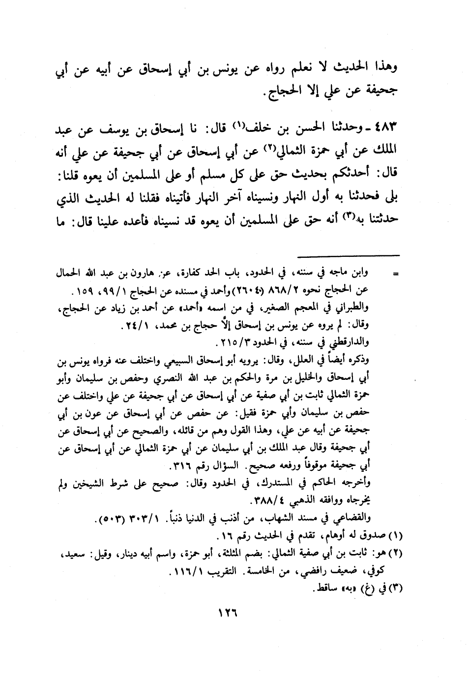 483 - وَحَدَّثَنَا الْحَسَنُ بْنُ خَلَفٍ، قَالَ: نا إِسْحَاقُ بْنُ يُوسُفَ، عَنْ عَبْدِ الْمَلِكِ، عَنْ أَبِي حَمْزَةَ الثُّمَالِيِّ، عَنْ أَبِي إِسْحَاقَ، عَنْ أَبِي جُحَيْفَةَ، عَنْ عَلِيٍّ أَنَّهُ قَالَ: أُحَدِّثُكُمْ بِحَدِيثٍ حَقٌّ عَلَى كُلِّ مُسْلِمٍ أَوْ عَلَى الْمُسْلِمِينَ أَنْ يَعُوهُ، قُلْنَا: بَلَى فَحَدَّثَنَا بِهِ أَوَّلَ النَّهَارَ وَنَسِينَاهُ آخِرَ النَّهَارِ، فَأَتَيْنَاهُ فَقُلْنَا لَهُ: الْحَدِيثَ الَّذِي حَدَّثَتْنَا بِهِ أَنَّهُ حَقٌّ عَلَى الْمُسْلِمِينَ أَنْ يَعُوهُ قَدْ نَسِينَاهُ فَأَعِدْهُ عَلَيْنَا، قَالَ: " §مَا -[127]- مِنْ عَبْدٍ مُسْلِمٍ يُذْنِبُ ذَنْبًا، فَيَأْخُذُهُ اللَّهُ بِهِ فِي الدُّنْيَا، فَيُعَاقِبُهُ بِهِ، إِلَّا كَانَ اللَّهُ عَزَّ وَجَلَّ أَكْرَمَ مِنْ أَنْ يَعُودَ فِي عُقُوبَتِهِ يَوْمَ الْقِيَامَةِ، وَمَا مِنْ مُسْلِمِ يُذْنِبُ ذَنْبًا، فَيَغْفِرُ اللَّهُ عَنْهُ فِي الدُّنْيَا، إِلَّا كَانَ اللَّهُ أَكْرَمَ مِنْ أَنْ يَعُودَ فِي عُقُوبَتِهِ يَوْمَ الْقِيَامَةِ فِيمَا عَفَا عَنْهُ، ثُمَّ تَلَا هَذِهِ الْآيَةَ: {وَمَا أَصَابَكُمْ مِنْ مُصِيبَةٍ فَبِمَا كَسَبَتْ أَيْدِيكُمْ وَيَعْفُوا عَنْ كَثِيرٍ} "