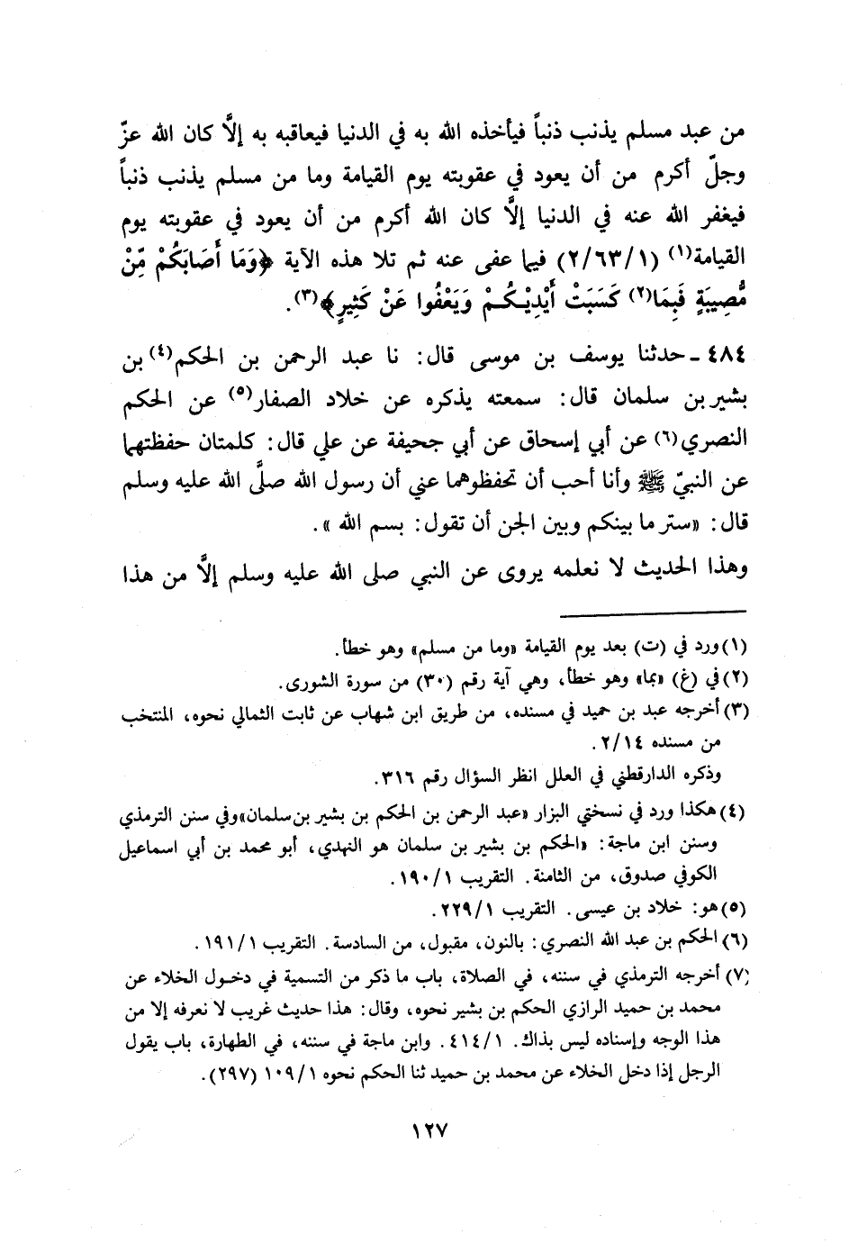 484 - حَدَّثَنَا يُوسُفُ بْنُ مُوسَى، قَالَ،: نا عَبْدُ الرَّحْمَنِ بْنُ الْحَكَمِ بْنِ بَشِيرِ بْنِ سَلْمَانَ، قَالَ: سَمِعْتُهُ يَذْكُرُهُ، عَنْ خَلَّادٍ الصَّفَّارُ، عَنِ الْحَكَمِ النَّصْرِيِّ، عَنْ أَبِي إِسْحَاقَ، عَنْ أَبِي جُحَيْفَةَ، عَنْ عَلِيٍّ، قَالَ: كَلِمَتَانِ حَفِظْتُهُمَا عَنِ النَّبِيِّ صَلَّى اللهُ عَلَيْهِ وَسَلَّمَ وَأَنَا أُحِبُّ، أَنْ تَحْفَظُوهُمَا عَنِّي، أَنَّ رَسُولَ اللَّهِ صَلَّى اللهُ عَلَيْهِ وَسَلَّمَ قَالَ: " §سِتْرُ مَا بَيْنَكُمْ وَبَيْنِ الْجِنِّ أَنْ تَقُولَ: بِسْمِ اللَّهِ ". وَهَذَا الْحَدِيثُ لَا نَعْلَمُهُ يُرْوَى عَنِ النَّبِيِّ صَلَّى اللهُ عَلَيْهِ وَسَلَّمَ إِلَّا مِنْ هَذَا -[128]- الْوَجْهِ، وَقَدْ رُوِيَ عَنْ أَنَسٍ، عَنِ النَّبِيِّ صَلَّى اللهُ عَلَيْهِ وَسَلَّمَ أَنَّهُ قَالَ: " سِتْرُ مَا بَيْنَ أَعْيُنِ الْجِنِّ وَعَوْرَاتِ بَنِي آدَمَ