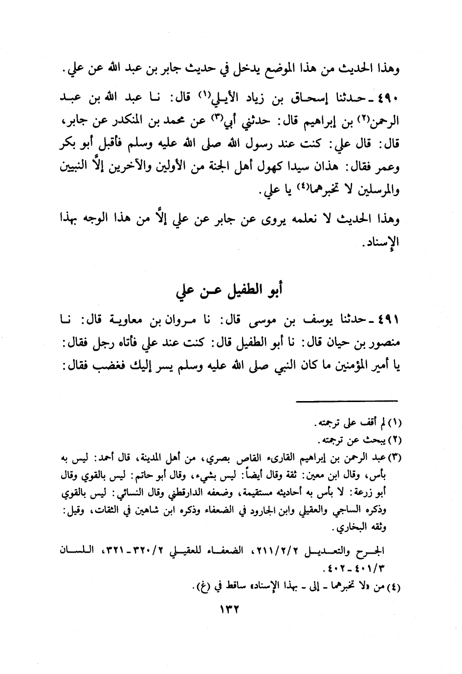 490 - حَدَّثَنَا إِسْحَاقُ بْنُ زِيَادٍ الْأَيْلِيُّ، قَالَ: نا عَبْدُ اللَّهِ بْنُ عَبْدِ الرَّحْمَنِ بْنِ إِبْرَاهِيمَ، قَالَ: حَدَّثَنِي أَبِي، عَنْ مُحَمَّدِ بْنِ الْمُنْكَدِرِ، عَنْ جَابِرٍ، قَالَ: قَالَ عَلِيٌّ: كُنْتُ عِنْدَ رَسُولِ اللَّهِ صَلَّى اللهُ عَلَيْهِ وَسَلَّمَ، فَأَقْبَلَ أَبُو بَكْرٍ، وَعُمَرُ فَقَالَ: «§هَذَانِ سَيِّدَا كُهُولِ أَهْلِ الْجَنَّةِ مِنَ الْأَوَّلِينَ وَالْآخِرِينَ، إِلَّا النَّبِيِّينَ وَالْمُرْسَلِينَ، لَا تُخْبِرْهُمَا يَا عَلِيُّ» . وَهَذَا الْحَدِيثُ لَا نَعْلَمُهُ يُرْوَى عَنْ جَابِرٍ، عَنْ عَلِيٍّ إِلَّا مِنْ هَذَا الْوَجْهِ بِهَذَا الْإِسْنَادِ