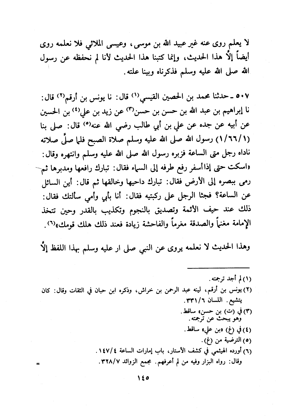 507 - حَدَّثَنَا مُحَمَّدُ بْنُ الْحُصَيْنِ الْقَيْسِيُّ، قَالَ: نا يُونُسُ بْنُ أَرْقَمَ، قَالَ: نا إِبْرَاهِيمُ بْنُ عَبْدِ اللَّهِ بْنِ حَسَنِ بْنِ حَسَنٍ، عَنْ زَيْدِ بْنِ عَلِيِّ بْنِ الْحُسَيْنِ، عَنْ أَبِيهِ، عَنْ جَدِّهِ، عَنْ عَلِيِّ بْنِ أَبِي طَالِبٍ، رَضِيَ اللَّهُ عَنْهُ قَالَ: صَلَّى بِنَا رَسُولُ اللَّهِ صَلَّى اللهُ عَلَيْهِ وَسَلَّمَ صَلَاةَ الصُّبْحِ، فَلَمَّا صَلَّى صَلَاتَهُ نَادَاهُ رَجُلٌ: " §مَتَى السَّاعَةُ؟ فَزَبَرَهُ رَسُولُ اللَّهِ صَلَّى اللهُ عَلَيْهِ وَسَلَّمَ وَانْتَهَرَهُ وَقَالَ: «اسْكُتْ» ، حَتَّى إِذَا أَسْفَرَ رَفَعَ طَرْفَهُ إِلَى السَّمَاءِ، فَقَالَ: «تَبَارَكَ رَافِعُهَا وَمُدَبِّرُهَا» ، ثُمَّ رَمَى بِبَصَرِهِ إِلَى الْأَرْضِ، فَقَالَ: «تَبَارَكَ دَاحِيهَا وَخَالِقُهَا» ، ثُمَّ قَالَ: «أَيْنَ السَّائِلُ عَنِ السَّاعَةِ؟» فَجَثَا الرَّجُلُ عَلَى رُكْبَتَيْهِ، فَقَالَ: أَنَا بِأَبِي وَأُمِّي سَأَلْتُكَ، فَقَالَ: «ذَلِكَ عِنْدَ حَيْفِ الْأَئِمَّةِ، وَتَصْدِيقٍ بِالنُّجُومِ، وَتَكْذِيبٍ بِالْقَدَرِ، وَحِينَ تُتَّخَذُ الْإِمَامَةُ مَغْنَمًا، وَالصَّدَقَةُ مَغْرَمًا وَالْفَاحِشَةُ زِيَادَةً، فَعِنْدَ ذَلِكَ هَلَكَ قَوْمُكَ» . وَهَذَا الْحَدِيثُ لَا نَعْلَمُهُ يُرْوَى عَنِ النَّبِيِّ صَلَّى اللهُ عَلَيْهِ وَسَلَّمَ بِهَذَا اللَّفْظِ إِلَّا -[146]- مِنْ هَذَا الْوَجْهِ بِهَذَا الْإِسْنَادِ. وَيُونُسُ بْنُ أَرْقَمَ كَانَ صَدُوقًا رَوَى عَنْهُ أَهْلُ الْعِلْمِ وَاحْتَمَلُوا حَدِيثَهُ عَلَى أَنَّ فِيهِ شِيعِيَّةً شَدِيدَةً