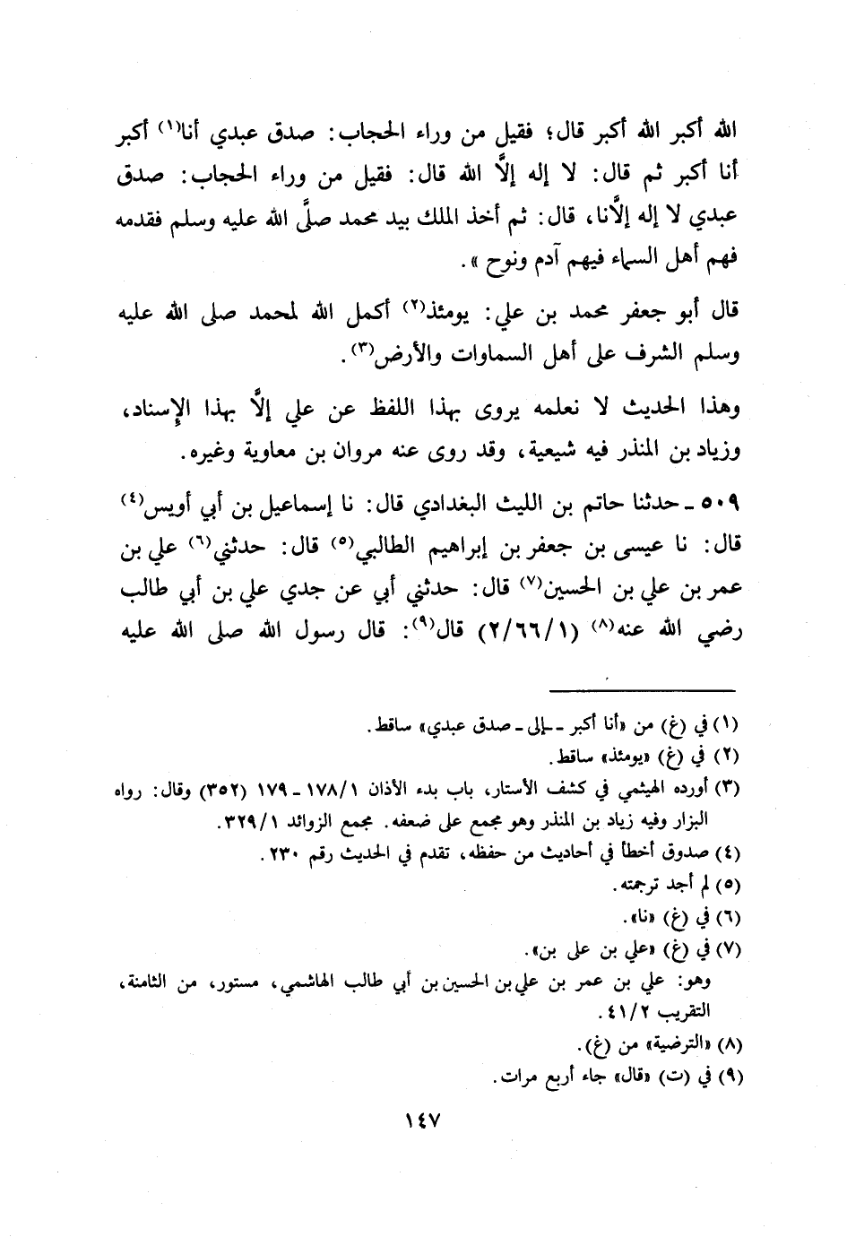 509 - حَدَّثَنَا حَاتِمُ بْنُ اللَّيْثِ الْبَغْدَادِيُّ، قَالَ: نا إِسْمَاعِيلُ بْنُ أَبِي أُوَيْسٍ، قَالَ: نا عِيسَى بْنُ جَعْفَرِ بْنِ إِبْرَاهِيمَ الطَّالَبِيُّ، قَالَ: حَدَّثَنِي عَلِيُّ بْنُ عُمَرَ بْنِ عَلِيِّ بْنِ الْحُسَيْنِ، قَالَ: حَدَّثَنِي أَبِي، عَنْ جَدِّي عَلِيِّ بْنِ أَبِي طَالِبٍ رَضِيَ اللَّهُ عَنْهُ، قَالَ: قَالَ رَسُولُ اللَّهِ صَلَّى اللَّهُ عَلَيْهِ -[148]- وسلم: «§لَا تَجْعَلُوا قَبْرِي عِيدًا، وَلَا بُيُوتَكُمْ قُبُورًا، وَصَلُّوا عَلَيَّ، وَسَلِّمُوا فَإِنَّ صَلَاتَكُمْ تَبْلُغُنِي» . وَهَذَا الْحَدِيثُ لَا نَعْلَمُهُ يُرْوَى عَنْ عَلِيٍّ إِلَّا مِنْ هَذَا الْوَجْهِ بِهَذَا الْإِسْنَادِ، وَقَدْ رُوِيَ بِهَذَا الْإِسْنَادِ أَحَادِيثُ صَالِحَةٌ فِيهَا مَنَاكِيرُ، فَذَكَرْنَا هَذَا الْحَدِيثَ؛ لِأَنَّهُ غَيْرُ مُنْكَرٍ: لَا تَجْعَلُوا قَبْرِي عِيدًا وَلَا بُيُوتَكُمْ قُبُورًا. قَدْ رُوِيَ عَنِ النَّبِيِّ صَلَّى اللهُ عَلَيْهِ وَسَلَّمَ مِنْ غَيْرِ هَذَا الْوَجْهِ