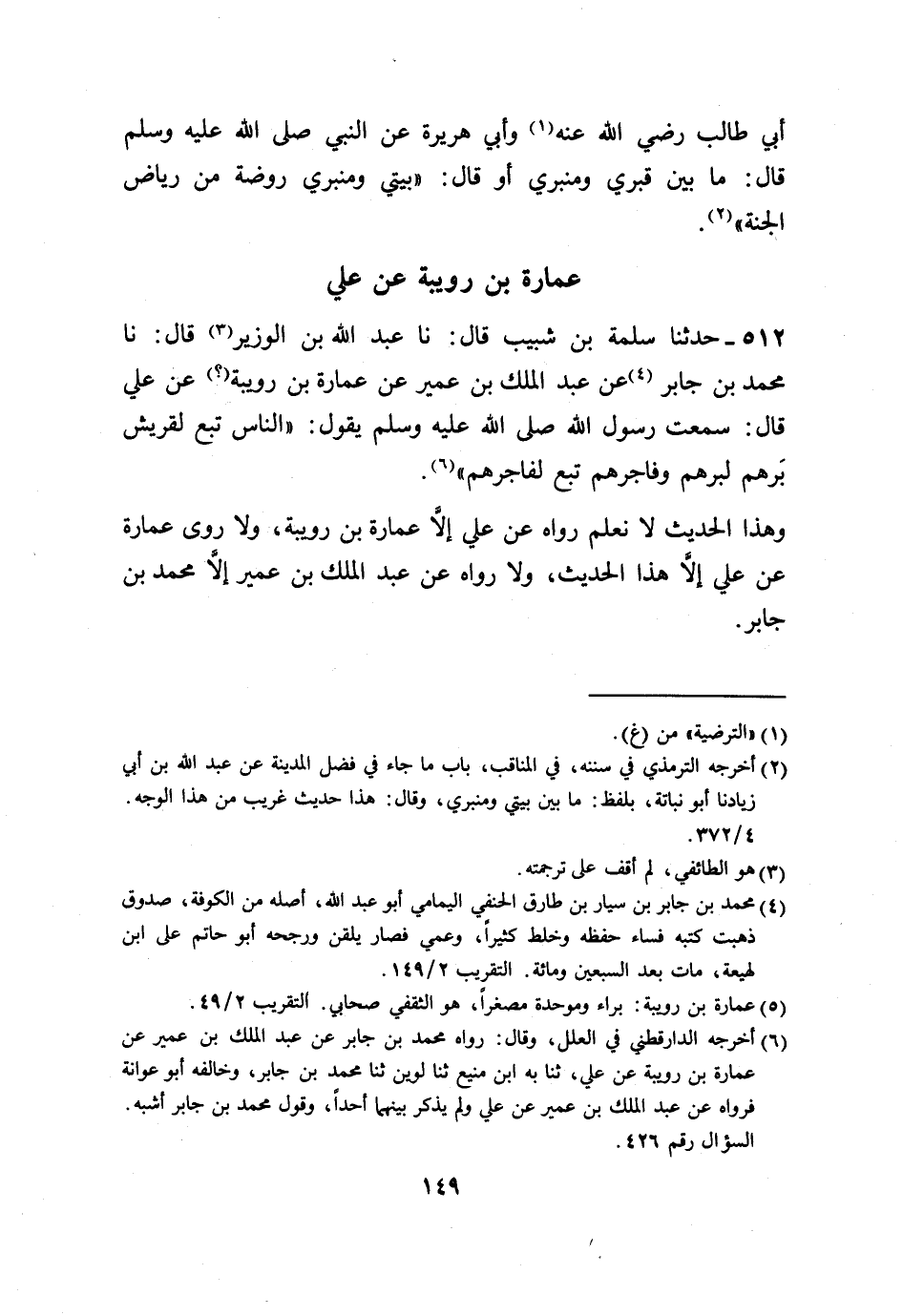 512 - حَدَّثَنَا سَلَمَةُ بْنُ شَبِيبٍ، قَالَ: نا عَبْدُ اللَّهِ بْنُ الْوَزِيرِ، قَالَ: نا مُحَمَّدُ بْنُ جَابِرٍ، عَنْ عَبْدِ الْمَلِكِ بْنِ عُمَيْرٍ، عَنْ عُمَارَةَ بْنِ رُوَيْبَةَ، عَنْ عَلِيٍّ، قَالَ: سَمِعْتُ رَسُولَ اللَّهِ صَلَّى اللهُ عَلَيْهِ وَسَلَّمَ يَقُولُ: «§النَّاسُ تَبَعٌ لِقُرَيْشٍ بَرُّهُمْ لِبَرِّهِمْ، وَفَاجِرُهُمْ تَبَعٌ لِفَاجِرِهِمْ» . وَهَذَا الْحَدِيثُ لَا نَعْلَمُ رَوَاهُ عَنْ عَلِيٍّ، إِلَّا عُمَارَةُ بْنُ رُوَيْبَةَ، وَلَا رَوَى عُمَارَةُ، عَنْ عَلِيٍّ إِلَّا هَذَا الْحَدِيثَ، وَلَا رَوَاهُ عَنْ عَبْدِ الْمَلِكِ بْنِ عُمَيْرٍ إِلَّا مُحَمَّدُ بْنُ جَابِرٍ -[150]-. وَعُمَارَةُ بْنُ رُوَيْبَةَ رَجُلٌ مِنْ أَصْحَابِ النَّبِيِّ صَلَّى اللهُ عَلَيْهِ وَسَلَّمَ رَوَى عَنْهُ أَحَادِيثَ