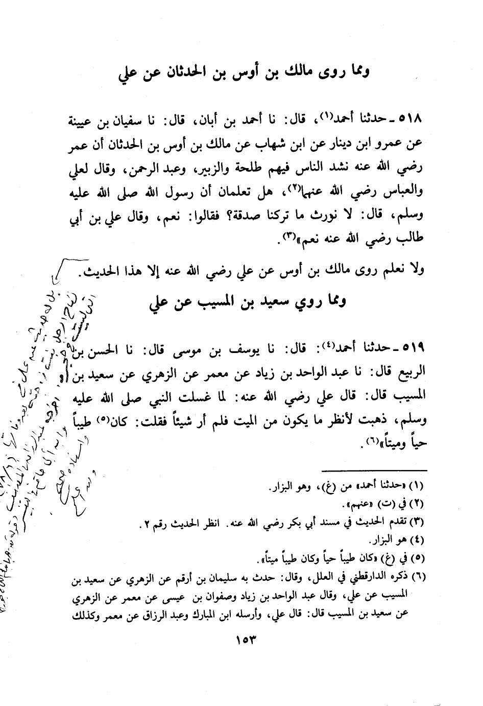 518 - نا أَحْمَدُ بْنُ أَبَانَ، قَالَ: نا سُفْيَانُ بْنُ عُيَيْنَةَ، عَنْ عَمْرِو بْنِ دِينَارٍ، عَنِ ابْنِ شِهَابٍ، عَنْ مَالِكِ بْنِ أَوْسِ بْنِ الْحَدَثَانِ: أَنَّ عُمَرَ رَضِيَ اللَّهُ عَنْهُ نَشَدَ النَّاسَ فِيهِمْ طَلْحَةُ، وَالزُّبَيْرُ، وَعَبْدُ الرَّحْمَنِ وَقَالَ: لِعَلِيٍّ وَالْعَبَّاسِ رَضِيَ اللَّهُ عَنْهُمَا: هَلْ تَعْلَمَانِ أَنَّ رَسُولَ اللَّهِ صَلَّى اللهُ عَلَيْهِ وَسَلَّمَ، قَالَ: «§لَا نُورَثُ مَا تَرَكْنَا صَدَقَةٌ» ، فَقَالُوا: نَعَمْ، وَقَالَ عَلِيُّ بْنُ أَبِي طَالِبٍ رَضِيَ اللَّهُ عَنْهُ: «نَعَمْ» ، وَلَا نَعْلَمُ رَوَى مَالِكُ بْنُ أَوْسٍ، عَنْ عَلِيٍّ رَضِيَ اللَّهُ عَنْهُ إِلَّا هَذَا الْحَدِيثَ