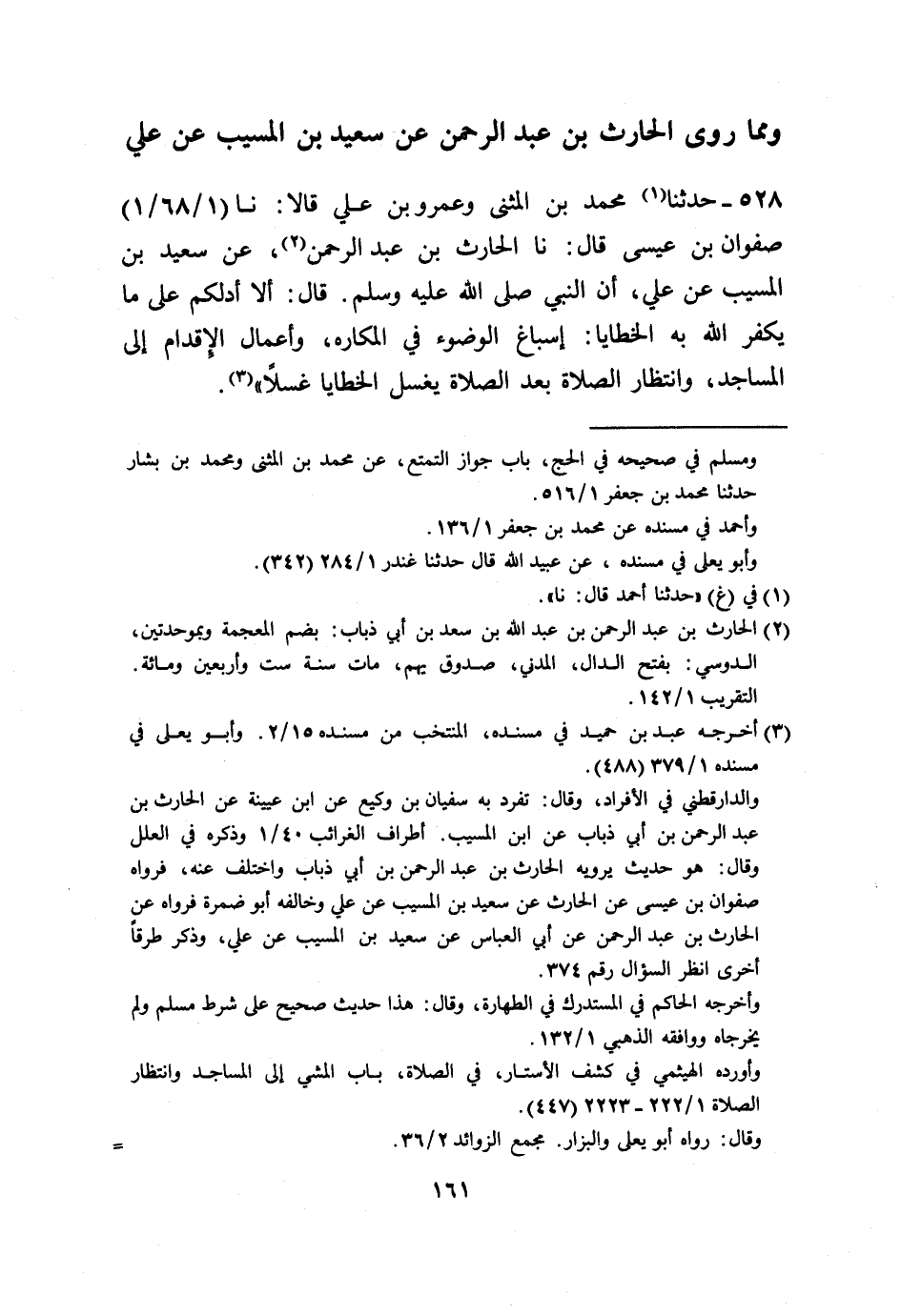 528 - حَدَّثَنَا مُحَمَّدُ بْنُ الْمُثَنَّى، وَعَمْرُو بْنُ عَلِيٍّ، قَالَا: نا صَفْوَانُ بْنُ عِيسَى، قَالَ: نا الْحَارِثُ بْنُ عَبْدِ الرَّحْمَنِ، عَنْ سَعِيدِ بْنِ الْمُسَيِّبِ، عَنْ عَلِيٍّ،: أَنَّ النَّبِيَّ صَلَّى اللهُ عَلَيْهِ وَسَلَّمَ، قَالَ: «§أَلَا أَدُلُّكُمْ عَلَى مَا يُكَفِّرُ اللَّهُ بِهِ الْخَطَايَا إِسْبَاغُ الْوُضُوءِ فِي الْمَكَارِهِ، وَإِعْمَالُ الْأَقْدَامِ إِلَى الْمَسَاجِدِ، وَانْتِظَارُ الصَّلَاةِ بَعْدَ الصَّلَاةِ، يَغْسِلُ الْخَطَايَا غَسْلًا» -[162]-، وَهَذَا الْحَدِيثُ هَكَذَا رَوَاهُ صَفْوَانُ، عَنِ الْحَارِثِ، عَنْ سَعِيدِ بْنِ الْمُسَيِّبِ وَقَالَ أَنَسُ بْنُ عِيَاضٍ وَغَيْرُهُ: عَنِ الْحَارِثِ، عَنْ أَبِي الْعَبَّاسِ، عَنْ سَعِيدِ بْنِ الْمُسَيِّبِ، وَأَبُو الْعَبَّاسِ مَجْهُولٌ،