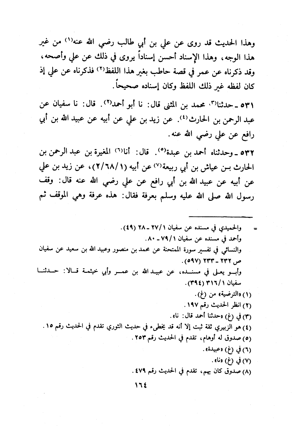 532 - وَحَدَّثَنَاهُ أَحْمَدُ بْنُ عَبْدَةَ، قَالَ: أنَا الْمُغِيرَةُ بْنُ عَبْدِ الرَّحْمَنِ بْنِ الْحَارِثِ بْنِ عَيَّاشِ بْنِ أَبِي رَبِيعَةَ، عَنْ أَبِيهِ، عَنْ زَيْدِ بْنِ عَلِيٍّ، عَنْ أَبِيهِ، عَنْ عُبَيْدِ اللَّهِ بْنِ أَبِي رَافِعٍ، عَنْ عَلِيٍّ، رَضِيَ اللَّهُ عَنْهُ قَالَ: وَقَفَ رَسُولُ اللَّهِ صَلَّى اللهُ عَلَيْهِ وَسَلَّمَ بِعَرَفَةَ، فَقَالَ: «هَذِهِ عَرَفَةُ وَهِيَ الْمَوْقِفُ» ، ثُمَّ -[165]- أَفَاضَ حِينَ غَرَبَتِ الشَّمْسُ، وَأَرْدَفَ أُسَامَةَ وَجَعَلَ يَسِيرُ عَلَى هَيْنَتِهِ، وَالنَّاسُ يَضْرِبُونَ يَمِينَا وَشِمَالًا لَا يَلْتَفِتُ إِلَيْهِمْ وَهُوَ يَقُولُ: «أَيُّهَا النَّاسُ عَلَيْكُمُ السَّكِينَةُ» ثُمَّ أَتَى جَمْعًا فَصَلَّى بِهِمُ الصَّلَاتَيْنِ جَمِيعًا، فَلَمَّا أَصْبَحَ أَتَى قُزَحَ، فَوَقَفَ، فَقَالَ: «هَذَا قُزَحُ وَهُوَ الْمَوْقِفُ، وَجَمْعٌ كُلُّهُ مَوْقِفٌ» ثُمَّ أَفَاضَ، فَلَمَّا أَتَى رَأْسَ مُحَسِّرٍ قَرَعَ نَاقَتَهُ فَخَبَّتْ حَتَّى إِذَا جَازَ الْوَادِيَ وَقَفَ وَأَرْدَفَ الْفَضْلَ، ثُمَّ أَتَى الْجَمْرَةَ فَرَمَاهَا، ثُمَّ أَتَى الْمَنْحَرَ، فَقَالَ: «هَذَا الْمَنْحَرُ وَمِنًى كُلُّهَا مَنْحَرٌ» فَاسْتَقْبَلَتْهُ جَارِيَةٌ، فَقَالَتْ: إِنَّ أَبِي شَيْخٌ كَبِيرٌ قَدْ أَفْنَدَ وَقَدْ أَدْرَكَتْهُ فَرِيضَةُ اللَّهِ فِي الْحَجِّ، أَفَيُجْزِي أَنْ أَحُجَّ عَنْهُ؟ قَالَ: «حُجِّي عَنْ أَبِيكِ» ، قَالَ: وَلَوَى عُنُقَ الْفَضْلِ قَالَ: فَقَالَ الْعَبَّاسُ: لِمَ لَوَيْتَ عُنُقَ ابْنِ عَمِّكَ؟ قَالَ: «رَأَيْتُ شَابًّا وَشَابَّةً فَلَمْ آمَنِ الشَّيْطَانَ عَلَيْهِمَا» قَالَ: وَأَتَاهُ رَجُلٌ، فَقَالَ: يَا رَسُولَ اللَّهِ أَفَضْتُ قَبْلَ أَنْ أَحْلِقَ، قَالَ: «§احْلِقْ أَوْ قَصِّرْ وَلَا حَرَجَ» قَالَ: وَأَتَاهُ رَجُلٌ، فَقَالَ: يَا رَسُولَ اللَّهِ إِنِّي ذَبَحْتُ قَبْلَ أَنْ أَرْمِيَ، فَقَالَ: «ارْمِ وَلَا حَرَجَ» قَالَ: ثُمَّ أَتَى الْبَيْتَ فَطَافَ ثُمَّ أَتَى زَمْزَمَ، فَقَالَ: «يَا بَنِي عَبْدِ الْمُطَّلِبِ سِقَايَتِكُمْ، فَلَوْلَا أَنْ يَغْلِبَكُمُ النَّاسُ لَنَزَعْتُ بِهَا» -[166]-، وَهَذَا الْحَدِيثُ لَا نَعْلَمُهُ يُرْوَى بِهَذَا اللَّفْظِ إِلَّا عَنْ عَلِيِّ بْنِ أَبِي طَالِبٍ رَضِيَ اللَّهُ عَنْهُ بِهَذَا الْإِسْنَادِ، وَعَبْدُ الرَّحْمَنِ بْنُ الْحَارِثِ رَوَى عَنْهُ الثَّوْرِيُّ، وَسُلَيْمَانُ بْنُ بِلَالٍ، وَعَبْدُ الرَّحْمَنِ بْنُ أَبِي الزِّنَادِ، وَابْنُهُ الْمُغِيرَةُ بْنُ عَبْدِ الرَّحْمَنِ، وَغَيْرِهِمْ. وَأَمَّا هَذَا الْحَدِيثُ فَلَا نَعْلَمُ رَوَاهُ إِلَّا الثَّوْرِيُّ، وَالْمُغِيرَةُ بْنُ عَبْدِ الرَّحْمَنِ