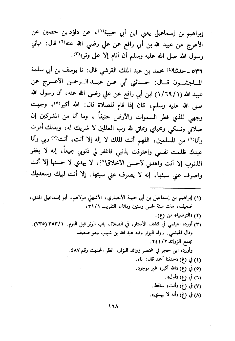 536 - حَدَّثَنَا مُحَمَّدُ بْنُ عَبْدِ الْمَلِكِ الْقُرَشِيُّ، قَالَ: نا يُوسُفُ بْنُ أَبِي سَلَمَةَ الْمَاجِشُونَ، قَالَ: حَدَّثَنِي أَبِي، عَنْ عَبْدِ الرَّحْمَنِ الْأَعْرَجِ، عَنْ عُبَيْدِ اللَّهِ بْنِ أَبِي رَافِعٍ، عَنْ عَلِيٍّ رَضِيَ اللَّهُ عَنْهُ: أَنَّ رَسُولَ اللَّهِ صَلَّى اللهُ عَلَيْهِ وَسَلَّمَ كَانَ إِذَا قَامَ لِلصَّلَاةِ، قَالَ: " §اللَّهُ أَكْبَرُ، وَجَّهْتُ وَجْهِيَ لِلَّذِي فَطَرَ السَّمَاوَاتِ وَالْأَرْضَ حَنِيفًا وَمَا أَنَا مِنَ الْمُشْرِكِينَ، {إِنَّ صَلَاتِي وَنُسُكِي وَمَحْيَايَ وَمَمَاتِي لِلَّهِ رَبِّ الْعَالَمِينَ} [الأنعام: 162] ، لَا شَرِيكَ لَهُ وَبِذَلِكَ أُمِرْتُ وَأَنَا مِنَ الْمُسْلِمِينَ، اللَّهُمَّ أَنْتَ الْمَلِكُ لَا إِلَهَ إِلَّا أَنْتَ، أَنْتَ رَبِّي وَأَنَا عَبْدُكَ، ظَلَمْتُ نَفْسِي وَاعْتَرَفْتُ بِذَنْبِي، فَاغْفِرْ لِي ذُنُوبِي جَمِيعًا إِنَّهُ لَا يَغْفِرُ الذُّنُوبَ إِلَّا أَنْتَ، وَاهْدِنِي لِأَحْسَنِ الْأَخْلَاقِ لَا يَهْدِي لِأَحْسَنِهَا إِلَّا أَنْتَ، وَاصْرِفْ عَنِّي سَيِّئَهَا إِنَّهُ لَا يَصْرِفُ عَنِّي سَيِّئَهَا إِلَّا أَنْتَ، لَبَّيْكَ وَسَعْدَيْكَ -[169]-، وَالْخَيْرُ كُلُّهُ فِي يَدَيْكَ، وَالشَّرُّ لَيْسَ إِلَيْكَ، أَنَا بِكَ وَإِلَيْكَ، تَبَارَكْتَ وَتَعَالَيْتَ، أَسْتَغْفِرُكَ وَأَتُوبُ إِلَيْكَ "، وَإِذَا رَكَعَ قَالَ: «اللَّهُمَّ لَكَ رَكَعْتُ، وَلَكَ أَسْلَمْتُ، وَبِكَ آمَنْتُ، خَشَعَ لَكَ سَمْعِي، وَبَصَرِي، وَعِظَامِي، وَمُخِّي، وَعَصَبِي» ، وَإِذَا رَفَعَ رَأْسَهُ، قَالَ: «سَمِعَ اللَّهُ لِمَنْ حَمِدَهُ، رَبَّنَا وَلَكَ الْحَمْدُ مِلْءَ السَّمَاوَاتِ، وَمِلْءَ الْأَرْضِ، وَمِلْءَ مَا بَيْنَهُمَا، وَمِلْءَ مَا شِئْتَ مِنْ شَيْءٍ بَعْدُ» ، وَإِذَا سَجَدَ، قَالَ: «اللَّهُمَّ لَكَ سَجَدْتُ، وَلَكَ أَسْلَمْتُ، وَبِكَ آمَنْتُ، سَجَدَ وَجْهِي لِلَّذِي خَلَقَهُ فَصَوَّرَهُ فَأَحْسَنَ صُورَتَهُ، وَشَقَّ سَمْعَهُ وَبَصَرَهُ، تَبَارَكَ اللَّهُ أَحْسَنُ الْخَالِقِينَ» وَإِذَا سَلَّمَ، قَالَ: «اللَّهُمَّ اغْفِرْ لِي مَا قَدَّمْتُ، وَمَا أَخَّرْتُ، وَمَا أَسْرَرْتُ، وَمَا أَسْرَفْتُ، وَمَا أَنْتَ أَعْلَمُ بِهِ مِنِّي، أَنْتَ الْمُقَدِّمُ، وَالْمُؤَخِّرُ لَا إِلَهَ إِلَّا أَنْتَ» . وَهَذَا الْكَلَامُ قَدْ رَوَاهُ نَحْوَهُ وَقَرِيبًا مِنْهُ مُحَمَّدُ بْنُ مَسْلَمَةَ، وَأَبُو رَافِعٍ، وَجَابِرٌ، وَأَتَمُّهُمْ لِهَذَا الْحَدِيثِ كَلَامًا وَأَصَحُّهُ إِسْنَادًا حَدِيثُ عَلِيٍّ رَضِيَ اللَّهُ عَنْهُ. وَإِنَّمَا احْتَمَلَهُ النَّاسُ عَلَى صَلَاةِ اللَّيْلِ