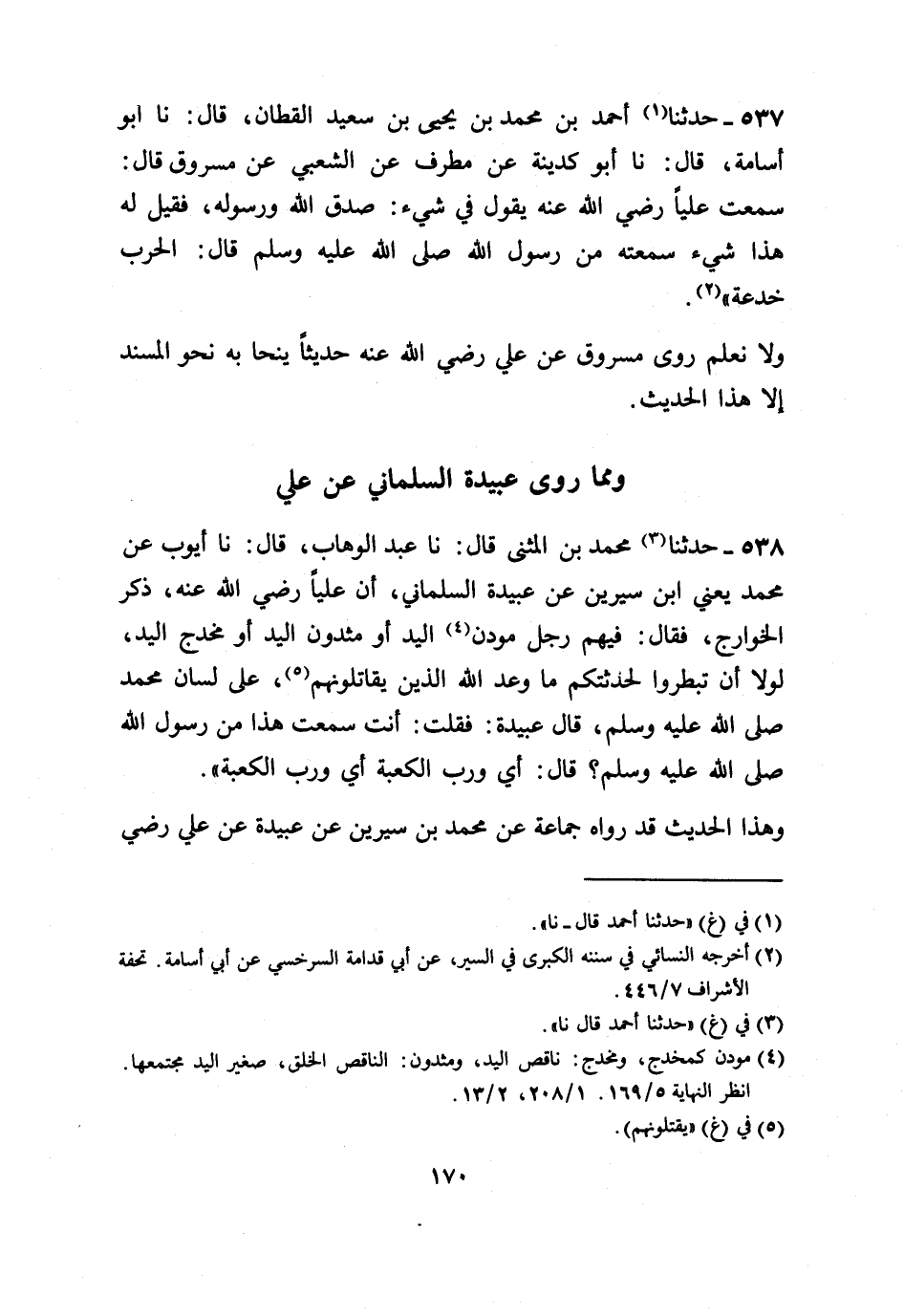 538 - حَدَّثَنَا مُحَمَّدُ بْنُ الْمُثَنَّى، قَالَ: نا عَبْدُ الْوَهَّابِ، قَالَ: نَا أَيُّوبُ، عَنْ مُحَمَّدٍ يَعْنِي ابْنَ سِيرِينَ، عَنْ عَبِيدَةَ السَّلْمَانِيِّ: أَنَّ عَلِيًّا رَضِيَ اللَّهُ عَنْهُ ذَكَرَ الْخَوَارِجَ، فَقَالَ: فِيهِمْ رَجُلٌ مُودَنُ الْيَدِ، أَوْ مَثْدُونُ الْيَدِ، أَوْ مُخْدَجُ الْيَدِ، " §لَوْلَا أَنْ تَبْطَرُوا لَحَدَّثْتُكُمْ مَا وَعَدَ اللَّهُ الَّذِينَ يُقَاتِلُونَهُمْ عَلَى لِسَانِ مُحَمَّدٍ صَلَّى اللهُ عَلَيْهِ وَسَلَّمَ، قَالَ عَبِيدَةُ: فَقُلْتُ: أَنْتَ سَمِعْتَ هَذَا مِنْ رَسُولِ اللَّهِ صَلَّى اللهُ عَلَيْهِ وَسَلَّمَ؟ قَالَ: إِي وَرَبِّ الْكَعْبَةِ، إِي وَرَبِّ الْكَعْبَةِ ". وَهَذَا الْحَدِيثُ قَدْ رَوَاهُ جَمَاعَةٌ عَنْ مُحَمَّدِ بْنِ سِيرِينَ، عَنْ عَبِيدَةَ، عَنْ عَلِيٍّ رَضِيَ -[171]- اللَّهُ عَنْهُ، مِنْهُمْ أَيُّوبُ، وَابْنُ عَوْنٍ، وَقَتَادَةُ، وَيُونُسُ بْنُ عُبَيْدٍ، وَعَوْنٌ، وَأَبُو عَمْرِو بْنُ الْعَلَاءِ، وَيَزِيدُ بْنُ إِبْرَاهِيمَ، وَجَرِيرُ بْنُ حَازِمٍ، فَأَمَّا حَدِيثُ أَيُّوبَ فَرَوَاهُ عَبْدُ الْوَهَّابِ،