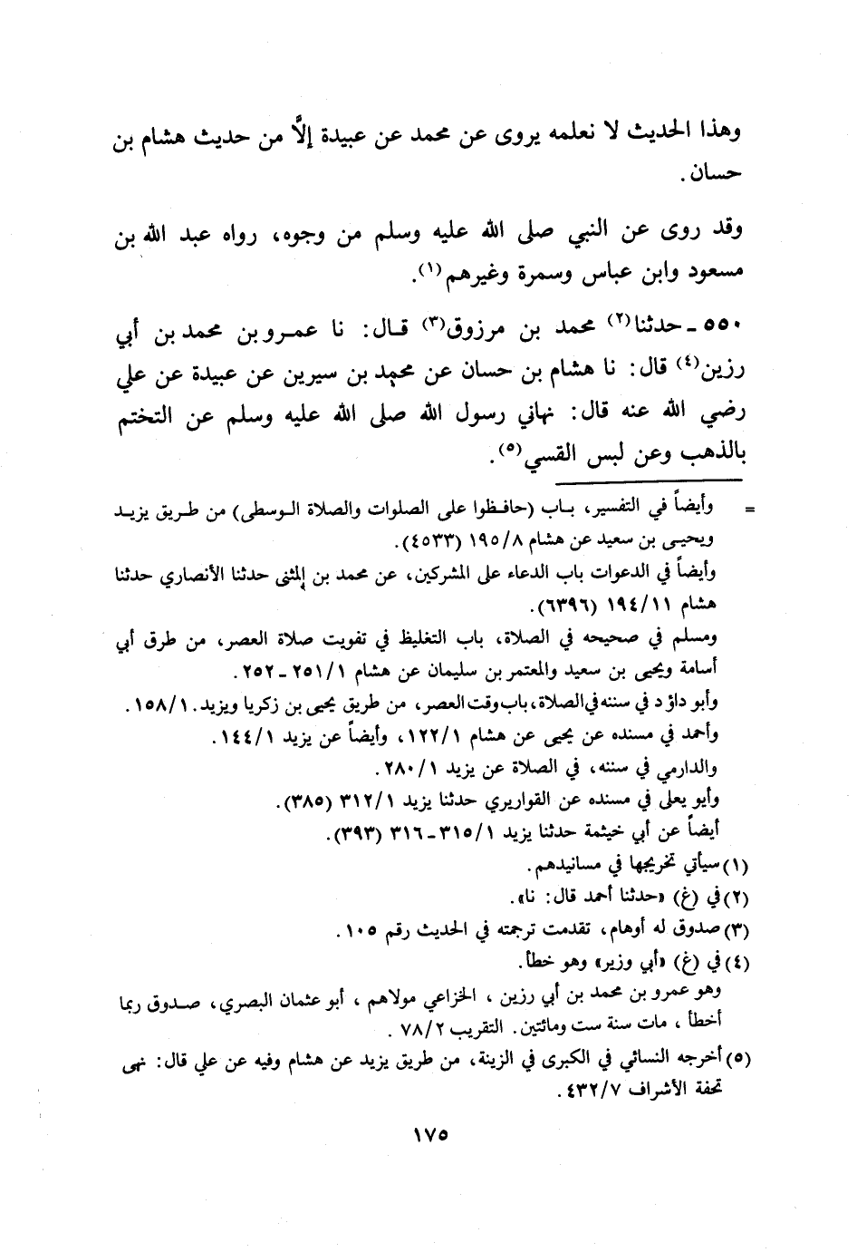 550 - حَدَّثَنَا مُحَمَّدُ بْنُ مَرْزُوقٍ، قَالَ: نا عَمْرُو بْنُ مُحَمَّدِ بْنِ أَبِي رَزِينٍ، قَالَ: نَا هِشَامُ بْنُ حَسَّانَ، عَنْ مُحَمَّدِ بْنِ سِيرِينَ، عَنْ عَبِيدَةَ، عَنْ عَلِيٍّ رَضِيَ اللَّهُ عَنْهُ قَالَ: نَهَانِي رَسُولُ اللَّهِ صَلَّى اللهُ عَلَيْهِ وَسَلَّمَ عَنِ «§التَّخَتُّمِ بِالذَّهَبِ وَعَنْ لُبْسِ الْقَسِّيِّ» -[176]-، وَهَذَا الْكَلَامُ قَدْ رُوِيَ عَنْ عَلِيٍّ، رَضِيَ اللَّهُ عَنْهُ مِنْ غَيْرِ وَجْهٍ. وَهَذَا الْإِسْنَادُ إِسْنَادٌ صَحِيحٌ مِنْهَا، فَاقْتَصَرْنَا عَلَيْهِ