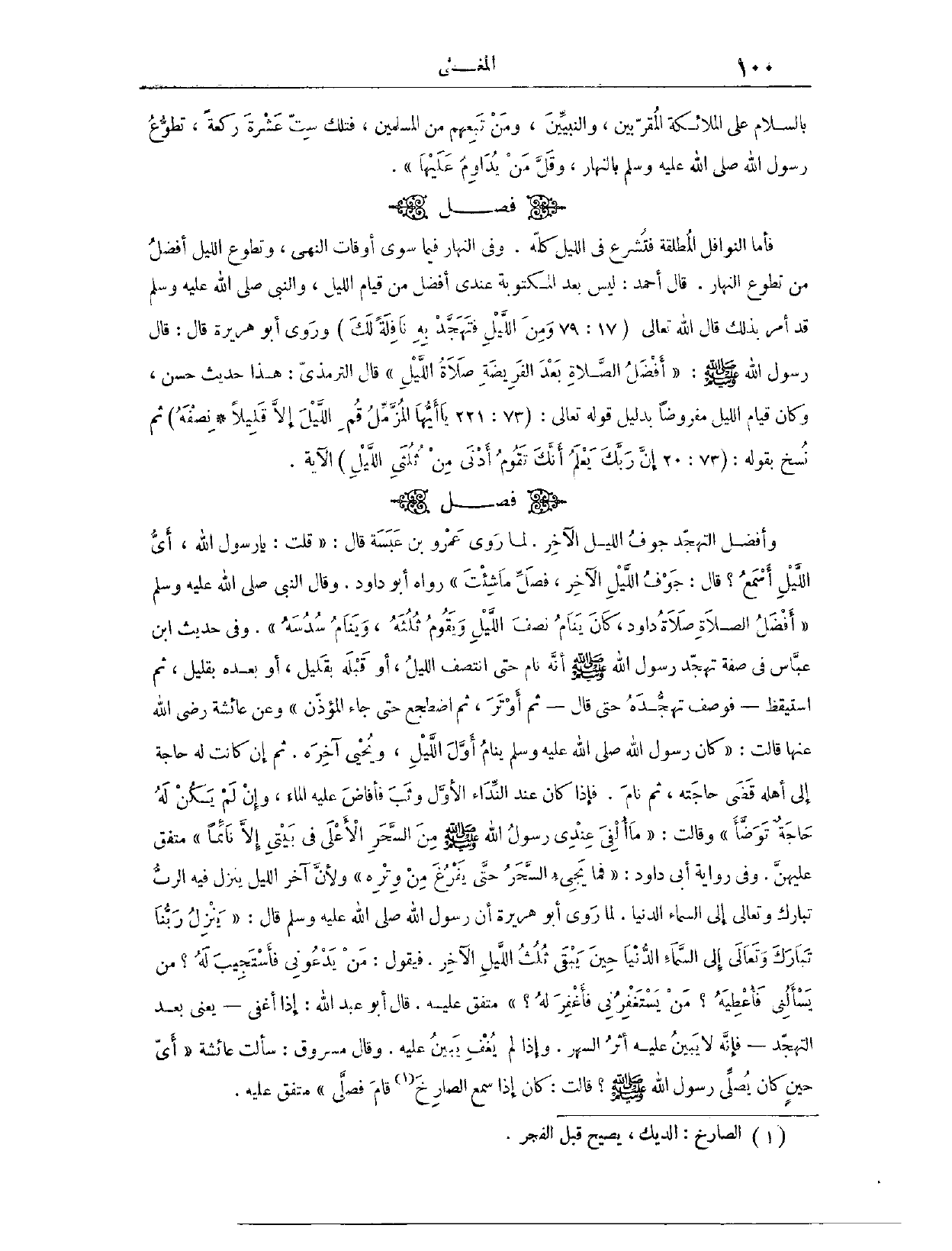 (١٠٥٠) فَصْلٌ: وَأَفْضَلُ التَّهَجُّدِ جَوْفُ اللَّيْلِ الْآخِرُ؛ لِمَا رَوَى عَمْرُو بْنُ عَبَسَةَ، قَالَ: «قُلْت: يَا رَسُولَ اللَّهِ، أَيُّ اللَّيْلِ أَسْمَعُ؟ قَالَ: جَوْفُ اللَّيْلِ الْآخِرُ، فَصَلِّ مَا شِئْتَ» . رَوَاهُ أَبُو دَاوُد. وَقَالَ النَّبِيُّ - صَلَّى اللَّهُ عَلَيْهِ وَسَلَّمَ -: «أَفْضَلُ الصَّلَاةِ صَلَاةُ دَاوُد، كَانَ يَنَامُ نِصْفَ اللَّيْلِ، وَيَقُومُ ثُلُثَهُ، وَيَنَامُ سُدُسَهُ» . وَفِي حَدِيثِ ابْنِ عَبَّاسٍ فِي «صِفَةِ تَهَجُّدِ رَسُولِ اللَّهِ - صَلَّى اللَّهُ عَلَيْهِ وَسَلَّمَ - أَنَّهُ نَامَ حَتَّى انْتَصَفَ اللَّيْلُ، أَوْ قَبْلَهُ بِقَلِيلٍ، أَوْ بَعْدَهُ بِقَلِيلٍ، ثُمَّ اسْتَيْقَظَ - فَوَصَفَ تَهَجُّدَهُ حَتَّى قَالَ: ثُمَّ أَوْتَرَ، ثُمَّ اضْطَجَعَ حَتَّى جَاءَ الْمُؤَذِّنُ» . وَعَنْ عَائِشَةَ - رَضِيَ اللَّهُ عَنْهَا - قَالَتْ: «كَانَ رَسُولُ اللَّهِ - صَلَّى اللَّهُ عَلَيْهِ وَسَلَّمَ - يَنَامُ أَوَّلَ اللَّيْلِ، وَيُحْيِي آخِرَهُ، ثُمَّ إنْ كَانَتْ لَهُ حَاجَةٌ إلَى أَهْلِهِ قَضَى حَاجَتَهُ، ثُمَّ نَامَ، فَإِذَا كَانَ عِنْدَ النِّدَاءِ الْأَوَّلِ وَثَبَ، فَأَفَاضَ عَلَيْهِ الْمَاءَ، وَإِنْ لَمْ يَكُنْ لَهُ حَاجَةٌ تَوَضَّأَ. وَقَالَتْ: مَا أَلْفَى عِنْدِي رَسُولَ اللَّهِ - صَلَّى اللَّهُ عَلَيْهِ وَسَلَّمَ - السَّحَرُ الْأَعْلَى فِي بَيْتِي إلَّا نَائِمًا» . مُتَّفَقٌ عَلَيْهِنَّ. وَفِي رِوَايَةِ أَبِي دَاوُد: «فَمَا يَجِيءُ السَّحَرُ حَتَّى يَفْرُغَ مِنْ وِتْرِهِ» ، وَلِأَنَّ آخِرَ اللَّيْلِ يَنْزِلُ فِيهِ الرَّبُّ تَبَارَكَ وَتَعَالَى إلَى السَّمَاءِ الدُّنْيَا؛ لِمَا رَوَى أَبُو هُرَيْرَةَ، أَنَّ رَسُولَ اللَّهِ - صَلَّى اللَّهُ عَلَيْهِ وَسَلَّمَ - قَالَ: «يَنْزِلُ رَبُّنَا تَبَارَكَ وَتَعَالَى إلَى السَّمَاءِ الدُّنْيَا حِينَ يَبْقَى ثُلُثُ اللَّيْلِ الْآخِرُ، فَيَقُولُ: مَنْ يَدْعُونِي فَأَسْتَجِيبَ لَهُ؟ وَمَنْ يَسْأَلُنِي فَأُعْطِيَهُ؟ وَمَنْ يَسْتَغْفِرُنِي فَأَغْفِرَ لَهُ؟» مُتَّفَقٌ عَلَيْهِ. قَالَ أَبُو عَبْدِ اللَّهِ: إذَا أَغْفَى - يَعْنِي بَعْدَ التَّهَجُّدِ - فَإِنَّهُ لَا يَبِينُ عَلَيْهِ أَثَرُ السَّهَرِ، وَإِذَا لَمْ يُغْفِ يَبِينُ عَلَيْهِ. وَقَالَ مَسْرُوقٌ: «سَأَلْت عَائِشَةَ: أَيَّ حِينٍ كَانَ يُصَلِّي رَسُولُ اللَّهِ - صَلَّى اللَّهُ عَلَيْهِ وَسَلَّمَ -؟ قَالَتْ: كَانَ إذَا سَمِعَ الصَّارِخَ قَامَ، فَصَلَّى.» مُتَّفَقٌ عَلَيْهِ.