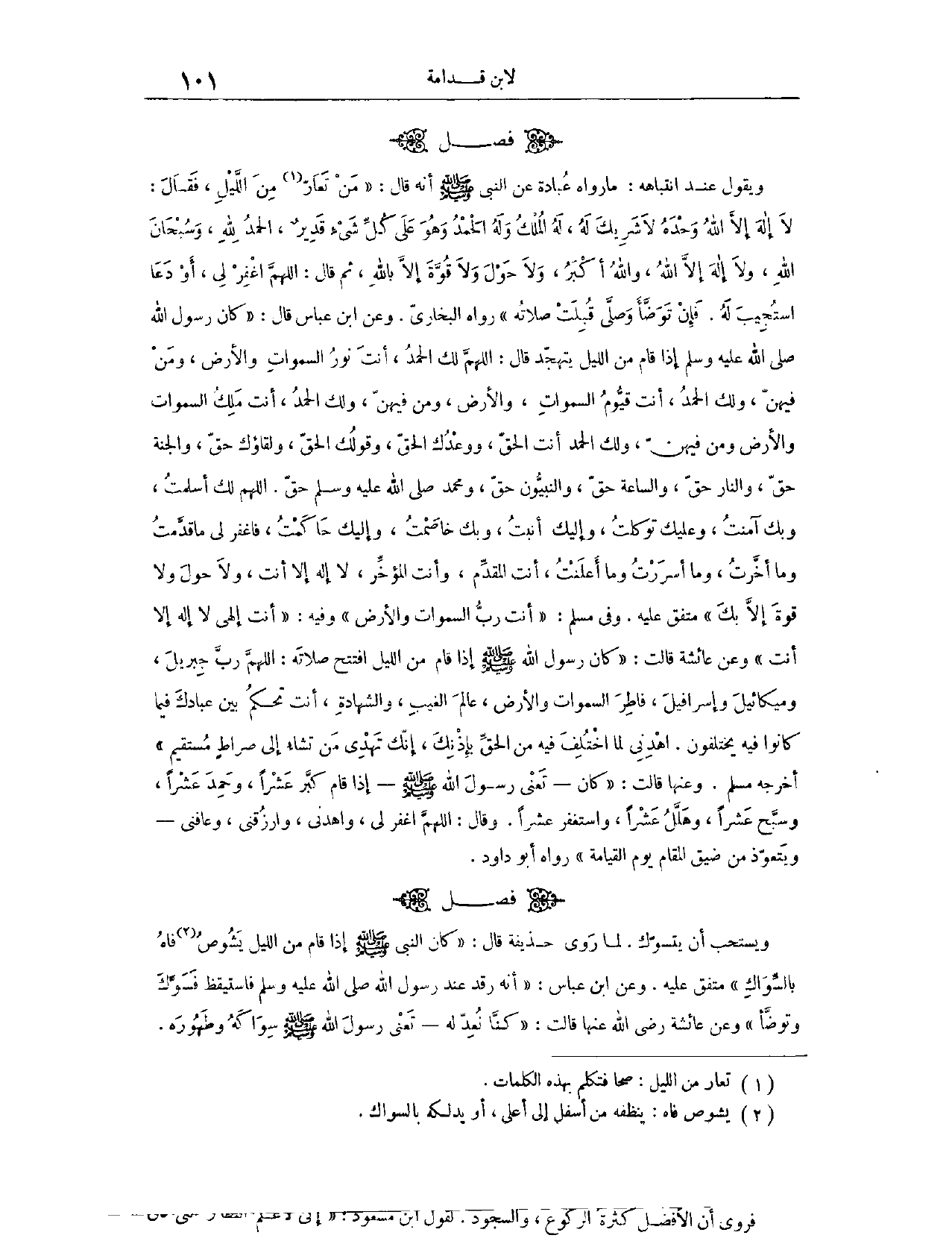 (١٠٥١) فَصْلٌ: وَيَقُولُ عِنْدَ انْتِبَاهِهِ مَا رَوَاهُ عُبَادَةُ، عَنْ النَّبِيِّ - صَلَّى اللَّهُ عَلَيْهِ وَسَلَّمَ - أَنَّهُ قَالَ: «مَنْ تَعَارَّ مِنْ اللَّيْلِ، فَقَالَ: لَا إلَهَ إلَّا اللَّهُ، وَحْدَهُ لَا شَرِيكَ لَهُ، لَهُ الْمُلْكُ وَلَهُ الْحَمْدُ، وَهُوَ عَلَى كُلِّ شَيْءٍ قَدِيرٌ، الْحَمْدُ لِلَّهِ، وَسُبْحَانَ اللَّهِ، وَلَا إلَهَ إلَّا اللَّهُ، وَاَللَّهُ أَكْبَرُ، وَلَا حَوْلَ وَلَا قُوَّةَ إلَّا بِاَللَّهِ، ثُمَّ قَالَ: اللَّهُمَّ اغْفِرْ لِي، أَوْ دَعَا اُسْتُجِيبَ لَهُ، فَإِنْ تَوَضَّأَ وَصَلَّى، قُبِلَتْ صَلَاتُهُ» . رَوَاهُ الْبُخَارِيُّ. وَعَنْ ابْنِ عَبَّاسٍ، قَالَ: «كَانَ رَسُولُ اللَّهِ - صَلَّى اللَّهُ عَلَيْهِ وَسَلَّمَ - إذَا قَامَ مِنْ اللَّيْلِ يَتَهَجَّدُ، قَالَ: اللَّهُمَّ لَكَ الْحَمْدُ، أَنْتَ نُورُ السَّمَوَاتِ وَالْأَرْضِ وَمَنْ فِيهِنَّ، وَلَكَ الْحَمْدُ، أَنْتَ قَيُّومُ السَّمَوَاتِ وَالْأَرْضِ وَمَنْ فِيهِنَّ، وَلَكَ الْحَمْدُ، أَنْتَ مَلِكُ السَّمَوَاتِ وَالْأَرْضِ وَمَنْ فِيهِنَّ، وَلَكَ الْحَمْدُ أَنْتَ الْحَقُّ؛ وَوَعْدُكَ الْحَقُّ، وَقَوْلُكَ الْحَقُّ، وَلِقَاؤُكَ حَقٌّ، وَالْجَنَّةُ حَقٌّ، وَالنَّارُ حَقٌّ، وَالسَّاعَةُ حَقٌّ، وَالنَّبِيُّونَ حَقٌّ، وَمُحَمَّدٌ - صَلَّى اللَّهُ عَلَيْهِ وَسَلَّمَ - حَقٌّ، اللَّهُمَّ لَكَ أَسْلَمْتُ، وَبِكَ آمَنْتُ، وَعَلَيْكَ تَوَكَّلْتُ، وَإِلَيْكَ أَنَبْتُ، وَبِكَ خَاصَمْتُ، وَإِلَيْكَ حَاكَمْتُ، فَاغْفِرْ لِي مَا قَدَّمْتُ وَمَا أَخَّرْتُ، وَمَا أَسْرَرْتُ وَمَا أَعْلَنْتُ، أَنْتَ الْمُقَدِّمُ وَأَنْتَ الْمُؤَخِّرُ، لَا إلَهَ إلَّا أَنْتَ، وَلَا حَوْلَ وَلَا قُوَّةَ إلَّا بِكَ» . مُتَّفَقٌ عَلَيْهِ. وَفِي مُسْلِمٍ: «أَنْتَ رَبُّ السَّمَوَاتِ وَالْأَرْضِ. وَفِيهِ: أَنْتَ إلَهِي لَا إلَهَ إلَّا أَنْتَ» . وَعَنْ عَائِشَةَ قَالَتْ: «كَانَ رَسُولُ اللَّهِ - صَلَّى اللَّهُ عَلَيْهِ وَسَلَّمَ - إذَا قَامَ مِنْ اللَّيْلِ افْتَتَحَ صَلَاتَهُ: اللَّهُمَّ رَبَّ جِبْرِيلَ وَمِيكَائِيلَ وَإِسْرَافِيلَ، فَاطِرَ السَّمَوَاتِ وَالْأَرْضِ، عَالِمَ الْغَيْبِ وَالشَّهَادَةِ، أَنْتَ تَحْكُمُ بَيْنَ عِبَادِكَ فِيمَا كَانُوا فِيهِ يَخْتَلِفُونَ، اهْدِنِي لِمَا اُخْتُلِفَ فِيهِ مِنْ الْحَقِّ بِإِذْنِكَ، إنَّكَ تَهْدِي مَنْ تَشَاءُ إلَى صِرَاطٍ مُسْتَقِيمٍ» . أَخْرَجَهُ مُسْلِمٌ وَعَنْهَا.
