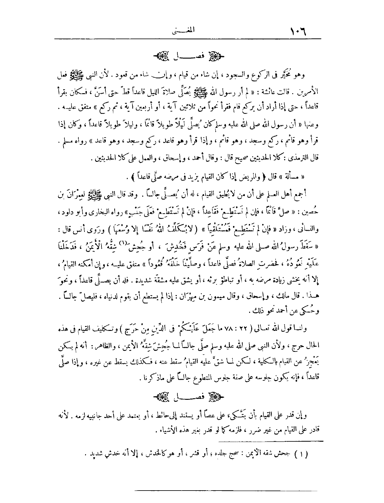 أَجْمَعَ أَهْلُ الْعِلْمِ عَلَى أَنَّ مَنْ لَا يُطِيقُ الْقِيَامَ، لَهُ أَنْ يُصَلِّيَ جَالِسًا. وَقَدْ «قَالَ النَّبِيُّ - صَلَّى اللَّهُ عَلَيْهِ وَسَلَّمَ - لِعِمْرَانَ بْنِ حُصَيْنٍ: صَلِّ قَائِمًا، فَإِنْ لَمْ تَسْتَطِعْ فَقَاعِدًا، فَإِنْ لَمْ تَسْتَطِعْ فَعَلَى جَنْبٍ» . رَوَاهُ الْبُخَارِيُّ، وَأَبُو دَاوُد، وَالنَّسَائِيُّ، وَزَادَ: «فَإِنْ لَمْ تَسْتَطِعْ فَمُسْتَلْقِيًا، {لا يُكَلِّفُ اللَّهُ نَفْسًا إِلا وُسْعَهَا} [البقرة: ٢٨٦] » . وَرَوَى أَنَسٌ قَالَ: «سَقَطَ رَسُولُ اللَّهِ - صَلَّى اللَّهُ عَلَيْهِ وَسَلَّمَ - عَنْ فَرَسٍ، فَخُدِشَ أَوْ جُحِشَ شِقُّهُ الْأَيْمَنُ، فَدَخَلْنَا عَلَيْهِ نَعُودُهُ. فَحَضَرَتْ الصَّلَاةُ، فَصَلَّى قَاعِدًا، وَصَلَّيْنَا خَلْفَهُ قُعُودًا» . مُتَّفَقٌ عَلَيْهِ. وَإِنْ أَمْكَنَهُ الْقِيَامُ، إلَّا أَنَّهُ يَخْشَى زِيَادَةَ مَرَضِهِ بِهِ، أَوْ تَبَاطُؤَ بُرْئِهِ، أَوْ يَشُقُّ عَلَيْهِ مَشَقَّةً شَدِيدَةً، فَلَهُ أَنْ يُصَلِّيَ قَاعِدًا. وَنَحْوَ هَذَا قَالَ مَالِكٌ وَإِسْحَاقُ.