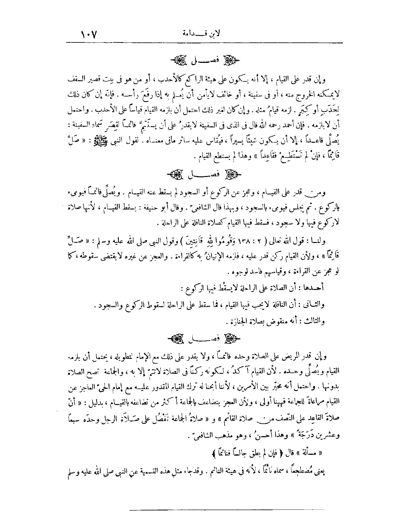 (١٠٦٧) فَصْلٌ: وَمَنْ قَدَرَ عَلَى الْقِيَامِ، وَعَجَزَ عَنْ الرُّكُوعِ أَوْ السُّجُودِ، لَمْ يَسْقُطْ عَنْهُ الْقِيَامُ، وَيُصَلِّي قَائِمًا، فَيُومِئُ بِالرُّكُوعِ، ثُمَّ يَجْلِسُ فَيُومِئُ بِالسُّجُودِ. وَبِهَذَا قَالَ الشَّافِعِيُّ. وَقَالَ أَبُو حَنِيفَةَ: يَسْقُطُ الْقِيَامُ. وَلِأَنَّهَا صَلَاةٌ لَا رُكُوعَ فِيهَا وَلَا سُجُودَ، فَسَقَطَ فِيهَا الْقِيَامُ كَصَلَاةِ النَّافِلَةِ عَلَى الرَّاحِلَةِ. وَلَنَا قَوْلُ اللَّهِ تَعَالَى: {وَقُومُوا لِلَّهِ قَانِتِينَ} [البقرة: ٢٣٨] . وَقَوْلُ النَّبِيِّ - صَلَّى اللَّهُ عَلَيْهِ وَسَلَّمَ -: «صَلِّ قَائِمًا» . وَلِأَنَّ الْقِيَامَ رُكْنٌ قَدَرَ عَلَيْهِ، فَلَزِمَهُ الْإِتْيَانُ بِهِ، كَالْقِرَاءَةِ، وَالْعَجْزُ عَنْ غَيْرِهِ لَا يَقْتَضِي سُقُوطَهُ، كَمَا لَوْ عَجَزَ عَنْ الْقِرَاءَةِ، وَقِيَاسُهُمْ فَاسِدٌ لِوُجُوهٍ: أَحَدُهَا، أَنَّ الصَّلَاةَ عَلَى الرَّاحِلَةِ لَا يَسْقُطُ فِيهَا الرُّكُوعُ. وَالثَّانِي، أَنَّ النَّافِلَةَ لَا يَجِبُ فِيهَا الْقِيَامُ، فَمَا سَقَطَ عَلَى الرَّاحِلَةِ لِسُقُوطِ الرُّكُوعِ وَالسُّجُودِ. وَالثَّالِثُ: أَنَّهُ مَنْقُوضٌ بِصَلَاةِ الْجِنَازَةِ.