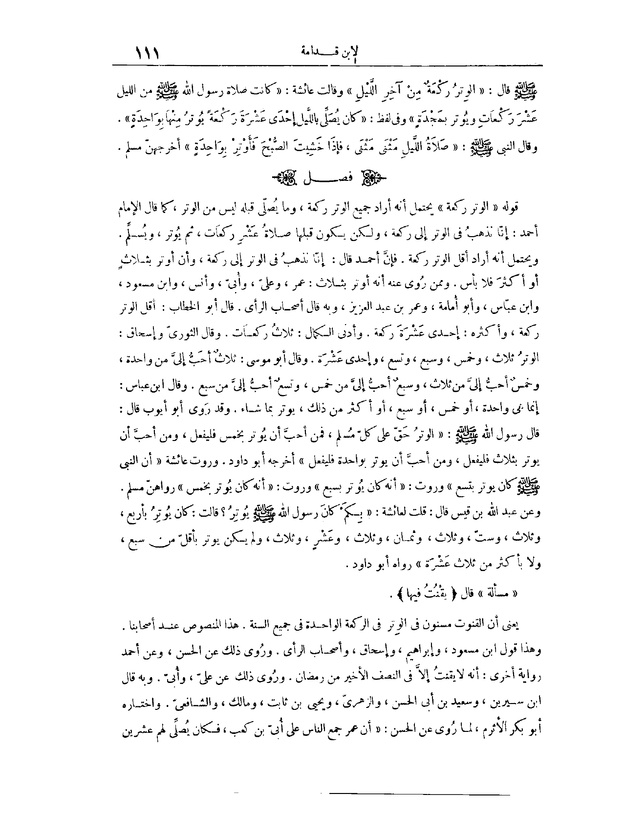 - صَلَّى اللَّهُ عَلَيْهِ وَسَلَّمَ - قَالَ: «الْوِتْرُ رَكْعَةٌ مِنْ آخِرِ اللَّيْلِ» . وَقَالَتْ: عَائِشَةُ: «كَانَتْ صَلَاةُ رَسُولِ اللَّهِ - صَلَّى اللَّهُ عَلَيْهِ وَسَلَّمَ - مِنْ اللَّيْلِ عَشْرَ رَكَعَاتٍ، وَيُوتِرُ بِسَجْدَةٍ» . وَفِي لَفْظٍ: «كَانَ يُصَلِّي بِاللَّيْلِ إحْدَى عَشْرَةَ رَكْعَةً، يُوتِرُ مِنْهَا بِوَاحِدَةٍ» . وَقَالَ النَّبِيُّ - صَلَّى اللَّهُ عَلَيْهِ وَسَلَّمَ -: «صَلَاةُ اللَّيْلِ مَثْنَى مَثْنَى، فَإِذَا خَشِيتَ الصُّبْحَ فَأَوْتِرْ بِوَاحِدَةٍ» . أَخْرَجَهُنَّ مُسْلِمٌ. (١٠٧٦) فَصْلٌ: قَوْلُهُ: «الْوِتْرُ رَكْعَةٌ» يَحْتَمِلُ أَنَّهُ أَرَادَ: جَمِيعُ الْوِتْرِ رَكْعَةٌ، وَمَا يُصَلَّى قَبْلَهُ لَيْسَ مِنْ الْوِتْرِ، كَمَا قَالَ الْإِمَامُ أَحْمَدُ: إنَّمَا نَذْهَبُ فِي الْوِتْرِ إلَى رَكْعَةٍ، وَلَكِنْ يَكُونُ قَبْلَهَا صَلَاةُ عَشْرِ رَكَعَاتٍ، ثُمَّ يُوتِرُ وَيُسَلِّمُ.