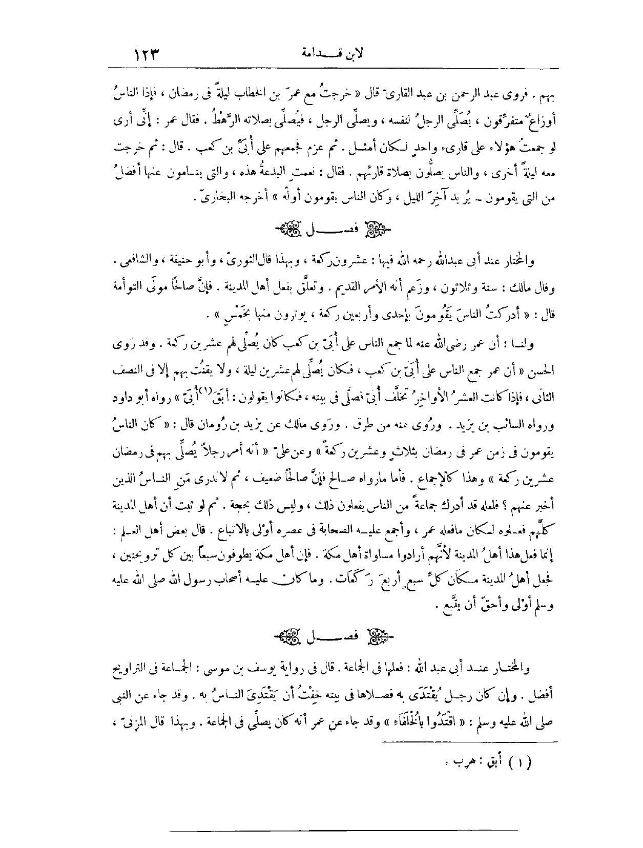 (١٠٩٦) فَصْلٌ: وَالْمُخْتَارُ عِنْدَ أَبِي عَبْدِ اللَّهِ، فِعْلُهَا فِي الْجَمَاعَةِ، قَالَ، فِي رِوَايَةِ يُوسُفَ بْنِ مُوسَى: الْجَمَاعَةُ فِي التَّرَاوِيحِ أَفْضَلُ، وَإِنْ كَانَ رَجُلٌ يُقْتَدَى بِهِ، فَصَلَّاهَا فِي بَيْتِهِ، خِفْت أَنْ يَقْتَدِيَ النَّاسُ بِهِ. وَقَدْ جَاءَ عَنْ النَّبِيِّ - صَلَّى اللَّهُ عَلَيْهِ وَسَلَّمَ -: «اقْتَدُوا بِالْخُلَفَاءِ» وَقَدْ جَاءَ عَنْ عُمَرَ أَنَّهُ كَانَ يُصَلِّي فِي الْجَمَاعَةِ. وَبِهَذَا قَالَ الْمُزَنِيّ،