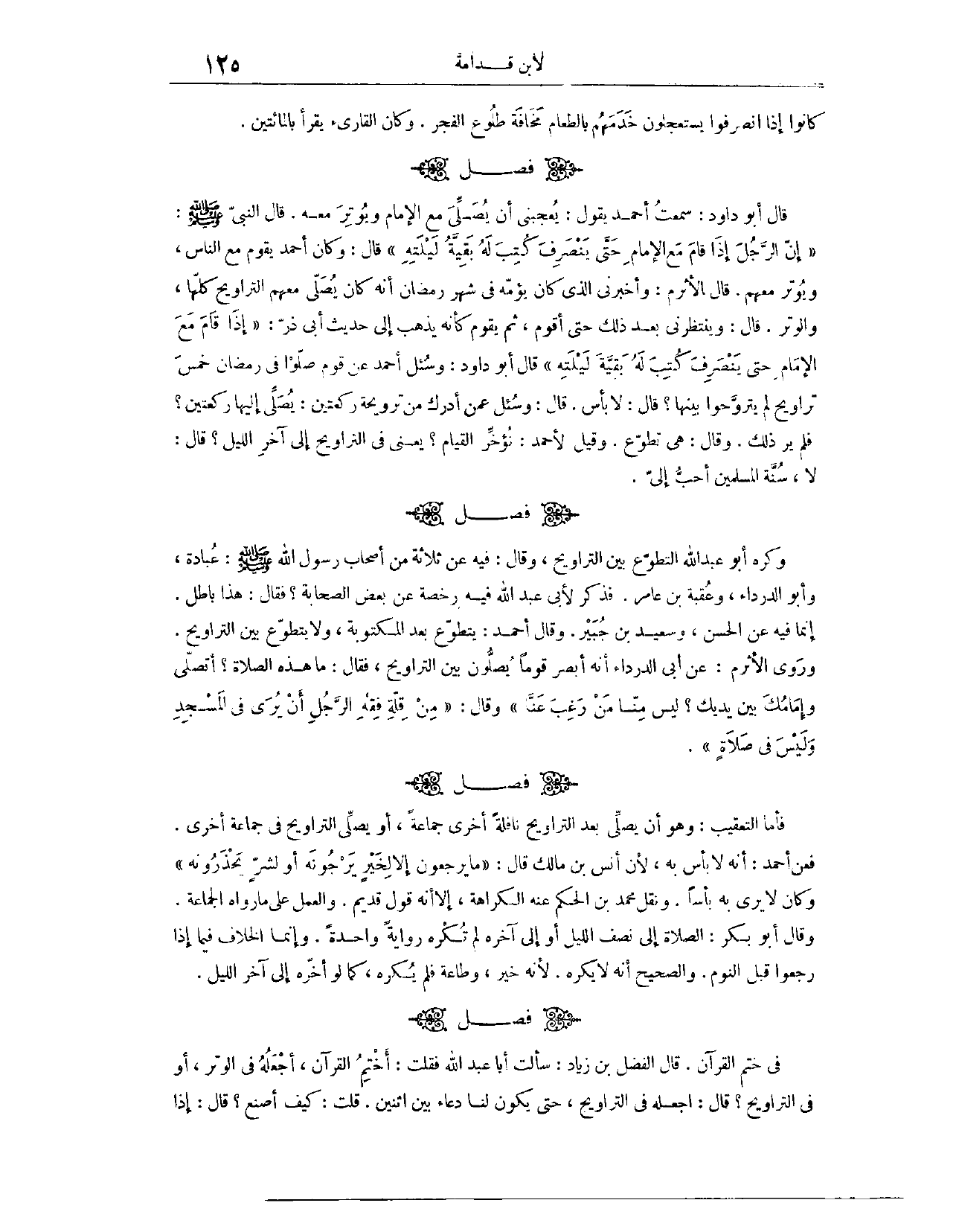 (١٠٩٩) فَصْلٌ: وَكَرِهَ أَبُو عَبْدِ اللَّهِ التَّطَوُّعَ بَيْنَ التَّرَاوِيحِ، وَقَالَ: فِيهِ عَنْ ثَلَاثَةٍ مِنْ أَصْحَابِ رَسُولِ اللَّهِ - صَلَّى اللَّهُ عَلَيْهِ وَسَلَّمَ -؛ عُبَادَةُ، وَأَبُو الدَّرْدَاءِ، وَعُقْبَةُ بْنُ عَامِرٍ. فَذُكِرَ لِأَبِي عَبْدِ اللَّهِ فِيهِ رُخْصَةٌ عَنْ بَعْضِ الصَّحَابَةِ، فَقَالَ: هَذَا بَاطِلٌ، إنَّمَا فِيهِ عَنْ الْحَسَنِ، وَسَعِيدِ بْنِ جُبَيْرٍ. وَقَالَ أَحْمَدُ: يَتَطَوَّعُ بَعْدَ الْمَكْتُوبَةِ، وَلَا يَتَطَوَّعُ بَيْنَ التَّرَاوِيحِ. وَرَوَى الْأَثْرَمُ عَنْ أَبِي الدَّرْدَاءِ، أَنَّهُ أَبْصَرَ قَوْمًا يُصَلُّونَ بَيْنَ التَّرَاوِيحِ، فَقَالَ: مَا هَذِهِ الصَّلَاةُ؟ أَتُصَلِّي وَإِمَامُكَ بَيْنَ يَدَيْكَ؟ لَيْسَ مِنَّا مَنْ رَغِبَ عَنَّا. وَقَالَ: مِنْ قِلَّةِ فِقْهِ الرَّجُلِ أَنْ يُرَى أَنَّهُ فِي الْمَسْجِدِ وَلَيْسَ فِي صَلَاةٍ.