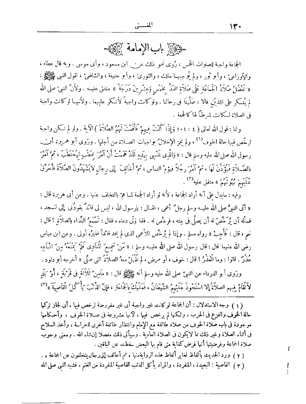 ِ الْجَمَاعَةُ وَاجِبَةٌ لِلصَّلَوَاتِ الْخَمْسِ، رُوِيَ نَحْوُ ذَلِكَ عَنْ ابْنِ مَسْعُودٍ، وَأَبِي مُوسَى. وَبِهِ قَالَ عَطَاءٌ، وَالْأَوْزَاعِيُّ، وَأَبُو ثَوْرٍ. وَلَمْ يُوجِبْهَا مَالِكٌ، وَالثَّوْرِيُّ، وَأَبُو حَنِيفَةَ، وَالشَّافِعِيُّ؛ لِقَوْلِ النَّبِيِّ - صَلَّى اللَّهُ عَلَيْهِ وَسَلَّمَ -: «تَفْضُلُ صَلَاةُ الْجَمَاعَةِ عَلَى صَلَاةِ الْفَذِّ بِخَمْسٍ وَعِشْرِينَ دَرَجَةً» . مُتَّفَقٌ عَلَيْهِ. وَلِأَنَّ النَّبِيَّ - صَلَّى اللَّهُ عَلَيْهِ وَسَلَّمَ - لَمْ يُنْكِرْ عَلَى اللَّذَيْنِ قَالَا: صَلَّيْنَا فِي رِحَالِنَا. وَلَوْ كَانَتْ وَاجِبَةً لَأَنْكَرَ عَلَيْهِمَا، وَلِأَنَّهَا لَوْ كَانَتْ وَاجِبَةً فِي الصَّلَاةِ لَكَانَتْ شَرْطًا لَهَا كَالْجُمُعَةِ.
