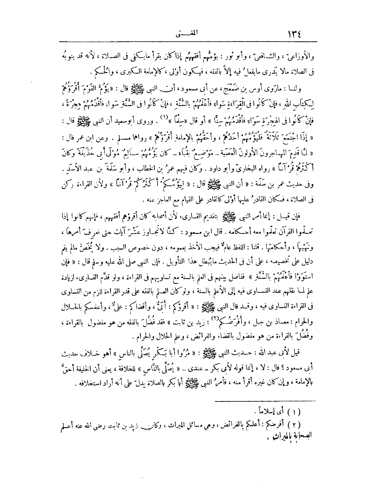 وَفِي حَدِيثِ عَمْرِو بْنِ سَلَمَةَ أَنَّ النَّبِيَّ - صَلَّى اللَّهُ عَلَيْهِ وَسَلَّمَ - قَالَ: «لِيَؤُمَّكُمْ أَكْثَرُكُمْ قُرْآنًا» . وَلِأَنَّ الْقِرَاءَةَ رُكْنٌ فِي الصَّلَاةِ فَكَانَ الْقَادِرُ عَلَيْهَا أَوْلَى، كَالْقَادِرِ عَلَى الْقِيَامِ مَعَ الْعَاجِزِ عَنْهُ. فَإِنْ قِيلَ: إنَّمَا أَمَرَ النَّبِيُّ - صَلَّى اللَّهُ عَلَيْهِ وَسَلَّمَ - بِتَقْدِيمِ الْقَارِئِ لِأَنَّ أَصْحَابَهُ كَانَ أَقْرَؤُهُمْ أَفْقَهَهُمْ، فَإِنَّهُمْ كَانُوا إذَا تَعَلَّمُوا الْقُرْآنَ تَعَلَّمُوا مَعَهُ أَحْكَامَهُ، قَالَ ابْنُ مَسْعُودٍ كُنَّا لَا نُجَاوِزُ عَشْرَ آيَاتٍ حَتَّى نَعْرِفَ أَمْرَهَا، وَنَهْيَهَا، وَأَحْكَامَهَا.