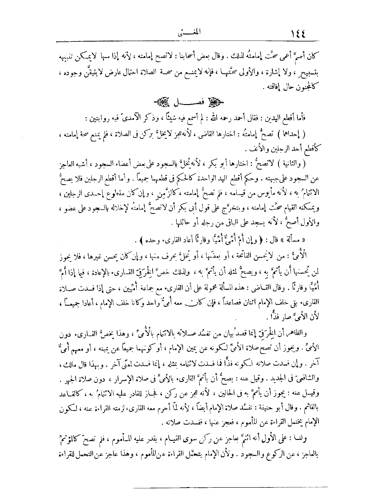 (١١٣٣) فَصْلٌ: فَأَمَّا أَقْطَعُ الْيَدَيْنِ، فَقَالَ أَحْمَدُ - رَحِمَهُ اللَّهُ -: لَمْ أَسْمَعْ فِيهِ شَيْئًا. وَذَكَرَ الْآمِدِيُّ فِيهِ رِوَايَتَيْنِ؛ إحْدَاهُمَا: تَصِحُّ إمَامَتُهُ. اخْتَارَهَا الْقَاضِي؛ لِأَنَّهُ عَجْزٌ لَا يُخِلُّ بِرُكْنٍ فِي الصَّلَاةِ. فَلَمْ يَمْنَعْ صِحَّةَ إمَامَتِهِ، كَأَقْطَعِ أَحَدِ الرِّجْلَيْنِ وَالْأَنْفِ. وَالثَّانِيَةُ: لَا تَصِحُّ. اخْتَارَهَا أَبُو بَكْرٍ؛ لِأَنَّهُ يُخِلُّ بِالسُّجُودِ عَلَى بَعْضِ أَعْضَاءِ السُّجُودِ، أَشْبَهَ الْعَاجِزَ عَنْ السُّجُودِ عَلَى جَبْهَتِهِ. وَحُكْمُ أَقْطَعِ الْيَدِ الْوَاحِدَةِ كَالْحُكْمِ فِي قَطْعِهِمَا جَمِيعًا، وَأَمَّا أَقْطَعُ الرِّجْلَيْنِ فَلَا يَصِحُّ الِائْتِمَامُ بِهِ؛ لِأَنَّهُ مَأْيُوسٌ مِنْ قِيَامِهِ، فَلَمْ تَصِحَّ إمَامَتُهُ كَالزَّمِنِ. وَإِنْ كَانَ مَقْطُوعَ إحْدَى الرِّجْلَيْنِ، وَيُمْكِنُهُ الْقِيَامُ، صَحَّتْ إمَامَتُهُ. وَيَتَخَرَّجُ عَلَى قَوْلِ أَبِي بَكْرٍ أَنْ لَا تَصِحَّ إمَامَتُهُ؛ لِإِخْلَالِهِ بِالسُّجُودِ عَلَى عُضْوٍ. وَالْأَوَّلُ أَصَحُّ؛ لِأَنَّهُ يَسْجُدُ عَلَى الْبَاقِي مِنْ رِجْلِهِ أَوْ حَائِلِهَا.
