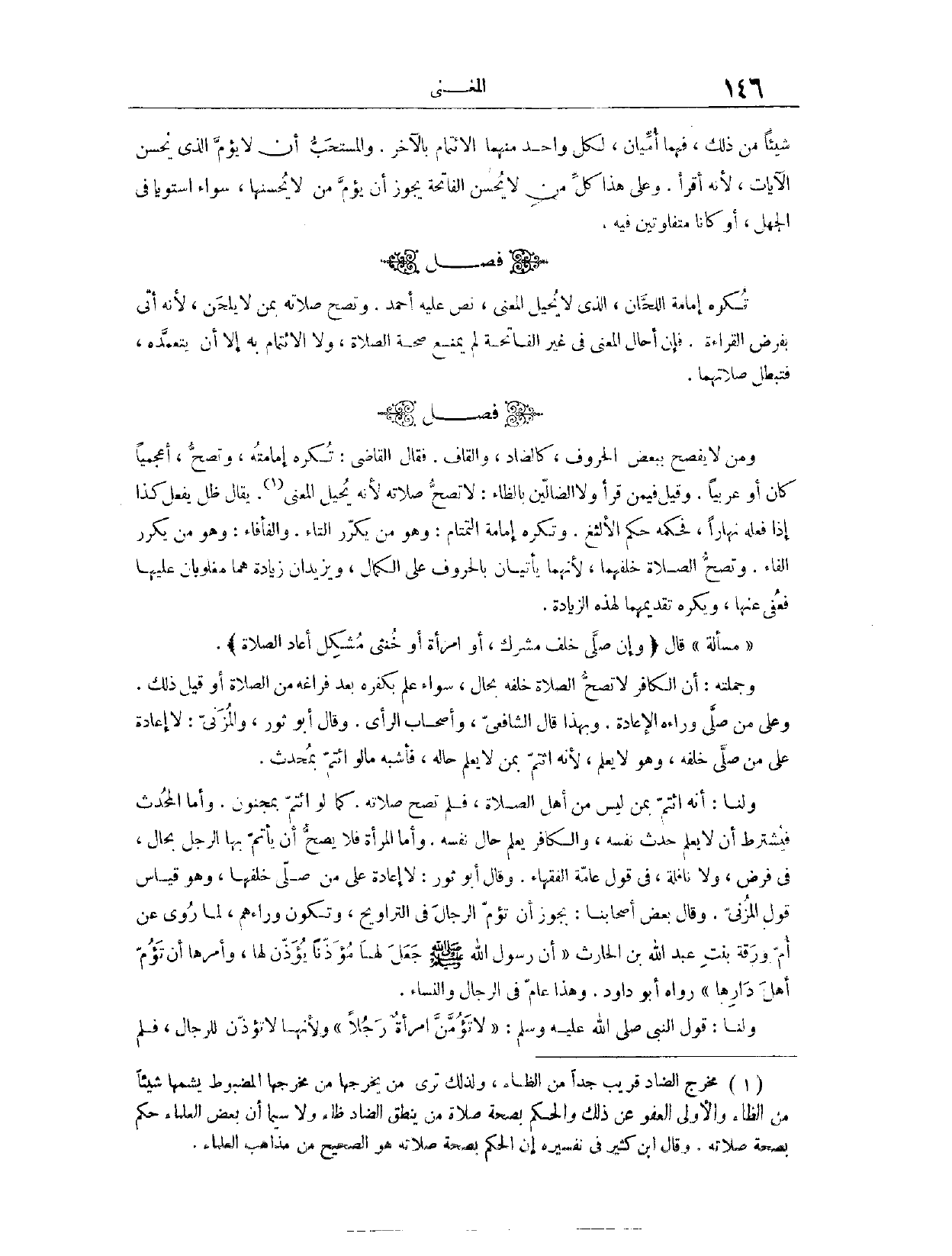 (١١٣٩) فَصْلٌ: وَمَنْ لَا يُفْصِحُ بِبَعْضِ الْحُرُوفِ، كَالضَّادِ وَالْقَافِ، فَقَالَ الْقَاضِي: تُكْرَهُ إمَامَتُهُ، وَتَصِحُّ، أَعْجَمِيًّا كَانَ أَوْ عَرَبِيًّا، وَقِيلَ فِي مَنْ قَرَأَ {وَلا الضَّالِّينَ} [الفاتحة: ٧] بِالظَّاءِ: لَا تَصِحُّ صَلَاتُهُ؛ لِأَنَّهُ يُحِيلُ الْمَعْنَى يُقَالُ: ظَلَّ يَفْعَلُ كَذَا: إذَا فَعَلَهُ نَهَارًا، فَحُكْمُهُ حُكْمُ الْأَلْثَغِ. وَتُكْرَهُ إمَامَةُ التَّمْتَامِ - وَهُوَ مَنْ يُكَرِّرُ التَّاءَ -، وَالْفَأْفَاءِ، وَهُوَ مَنْ يُكَرِّرُ الْفَاءَ. وَتَصِحُّ الصَّلَاةُ خَلْفَهُمَا؛ لِأَنَّهُمَا يَأْتِيَانِ بِالْحُرُوفِ عَلَى الْكَمَالِ، وَيَزِيدَانِ زِيَادَةً هُمَا مَغْلُوبَانِ عَلَيْهَا، فَعُفِيَ عَنْهَا، وَيُكْرَهُ تَقْدِيمُهُمَا لِهَذِهِ الزِّيَادَةِ.