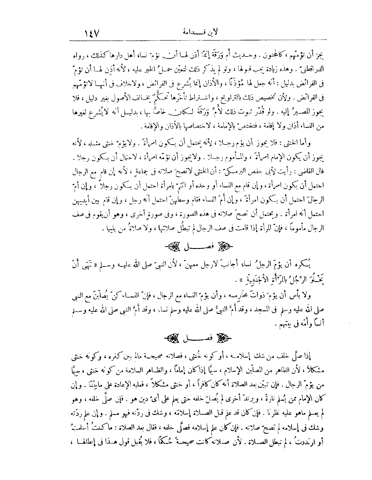 وَأَمَّا الْخُنْثَى فَلَا يَجُوزُ أَنْ يَؤُمَّ رَجُلًا؛ لِأَنَّهُ يَحْتَمِلُ أَنْ يَكُونَ امْرَأَةً، وَلَا يَؤُمُّ خُنْثَى مِثْلَهُ؛ لِأَنَّهُ يَجُوزُ أَنْ يَكُونَ الْإِمَامُ امْرَأَةً وَالْمَأْمُومُ رَجُلًا. وَلَا يَجُوزُ أَنْ تَؤُمَّهُ امْرَأَةٌ لِاحْتِمَالِ أَنْ يَكُونَ رَجُلًا. قَالَ الْقَاضِي: رَأَيْت لِأَبِي حَفْصٍ الْبَرْمَكِيِّ أَنَّ الْخُنْثَى لَا تَصِحُّ صَلَاتُهُ فِي جَمَاعَةٍ؛ لِأَنَّهُ إنْ قَامَ مَعَ الرِّجَالِ احْتَمَلَ أَنْ يَكُونَ امْرَأَةً، وَإِنْ قَامَ مَعَ النِّسَاءِ أَوْ وَحْدَهُ أَوْ ائْتَمَّ بِامْرَأَةٍ احْتَمَلَ أَنْ يَكُونَ رَجُلًا، وَإِنْ أَمَّ الرِّجَالَ احْتَمَلَ أَنْ يَكُونَ امْرَأَةً.
