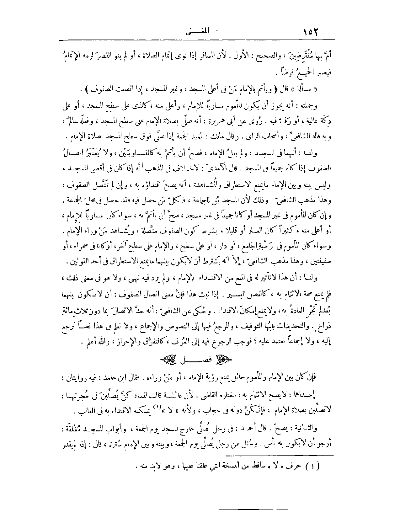 وَحُكِيَ عَنْ الشَّافِعِيِّ أَنَّهُ حَدَّ الِاتِّصَالَ بِمَا دُونَ ثَلَاثِ مِائَةِ ذِرَاعٍ. وَالتَّحْدِيدَاتُ بَابُهَا التَّوْقِيفُ، وَالْمَرْجِعُ فِيهَا إلَى النُّصُوصِ وَالْإِجْمَاعِ، وَلَا نَعْلَمُ فِي هَذَا نَصًّا نَرْجِعُ إلَيْهِ وَلَا إجْمَاعًا نَعْتَمِدُ عَلَيْهِ، فَوَجَبَ الرُّجُوعُ فِيهِ إلَى الْعُرْفِ، كَالتَّفَرُّقِ وَالْإِحْرَازِ، وَاَللَّهُ أَعْلَمُ. (١١٥٦) فَصْلٌ: فَإِنْ كَانَ بَيْنَ الْإِمَامِ وَالْمَأْمُومِ حَائِلٌ يَمْنَعُ رُؤْيَةَ الْإِمَامِ، أَوْ مَنْ وَرَاءَهُ، فَقَالَ ابْنُ حَامِدٍ: فِيهِ رِوَايَتَانِ؛ إحْدَاهُمَا، لَا يَصِحُّ الِائْتِمَامُ بِهِ. اخْتَارَهُ الْقَاضِي؛ لِأَنَّ عَائِشَةَ قَالَتْ لِنِسَاءٍ كُنَّ يُصَلِّينَ فِي حُجْرَتِهَا: لَا تُصَلِّينَ بِصَلَاةِ الْإِمَامِ، فَإِنَّكُنَّ دُونَهُ فِي حِجَابٍ. وَلِأَنَّهُ يُمْكِنُهُ الِاقْتِدَاءُ بِهِ فِي الْغَالِبِ. وَالثَّانِيَةُ: يَصِحُّ.