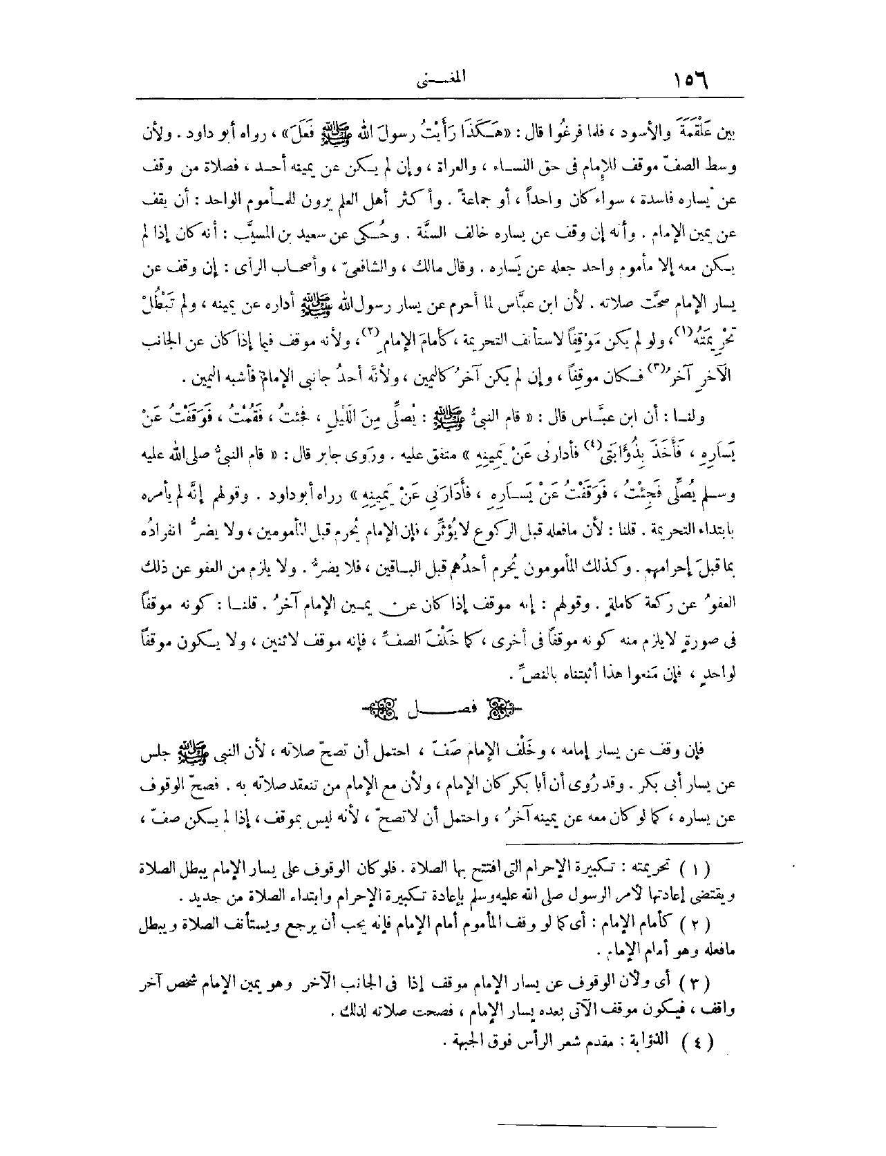 بَيْنَ عَلْقَمَةَ وَالْأَسْوَدِ، فَلَمَّا فَرَغُوا قَالَ: هَكَذَا رَأَيْت رَسُولَ اللَّهِ - صَلَّى اللَّهُ عَلَيْهِ وَسَلَّمَ - فَعَلَ. رَوَاهُ أَبُو دَاوُد. وَلِأَنَّ وَسَطَ الصَّفِّ مَوْقِفٌ لِلْإِمَامِ فِي حَقِّ النِّسَاءِ وَالْعُرَاةِ، وَإِنْ لَمْ يَكُنْ عَنْ يَمِينِهِ أَحَدٌ فَصَلَاةُ مَنْ وَقَفَ عَنْ يَسَارِهِ فَاسِدَةٌ، سَوَاءٌ كَانَ وَاحِدًا أَوْ جَمَاعَةً، وَأَكْثَرُ أَهْلِ الْعِلْمِ يَرَوْنَ لِلْمَأْمُومِ الْوَاحِدِ أَنْ يَقِفَ عَنْ يَمِينِ الْإِمَامِ، وَأَنَّهُ إنْ وَقَفَ عَنْ يَسَارِهِ، خَالَفَ السُّنَّةَ.
