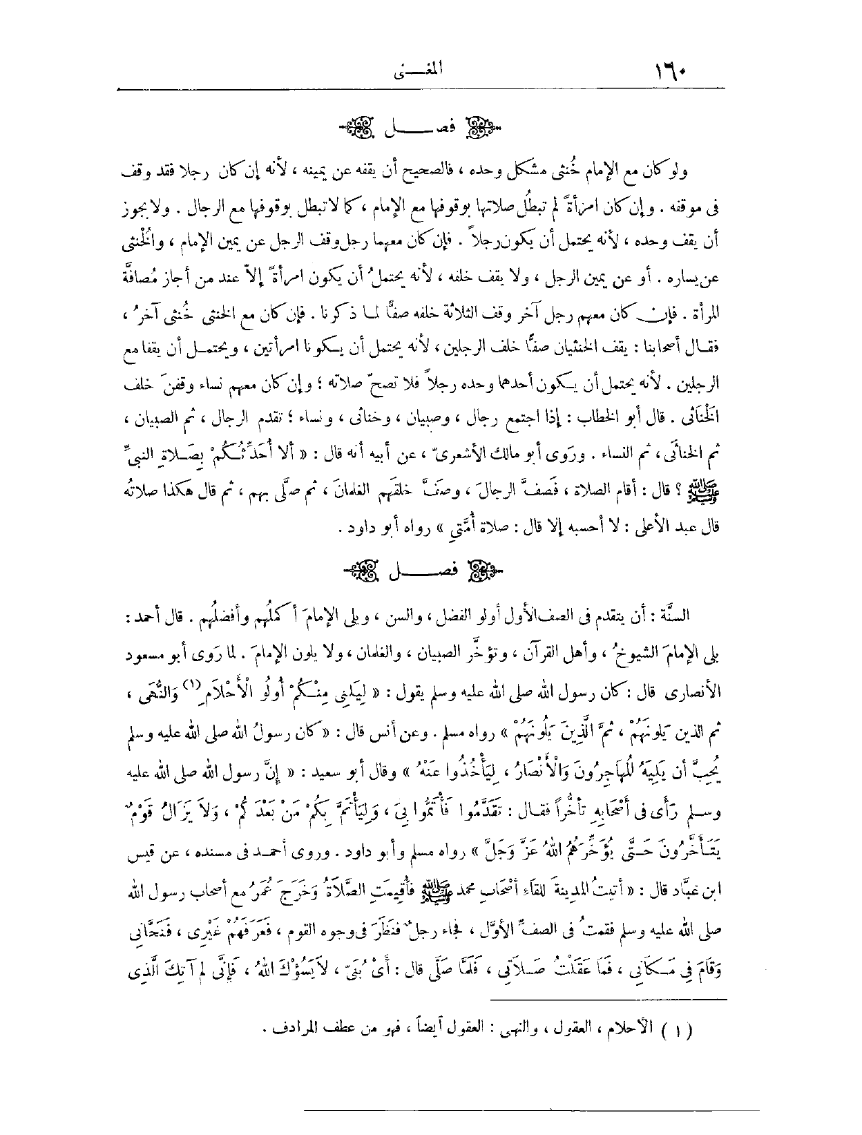 فَصْلٌ (١١٧٥) : السُّنَّةُ أَنْ يَتَقَدَّمَ فِي الصَّفِّ الْأَوَّلِ أُولُو الْفَضْلِ وَالسِّنِّ، وَيَلِي الْإِمَامَ أَكْمَلُهُمْ وَأَفْضَلُهُمْ. قَالَ أَحْمَدُ: يَلِي الْإِمَامَ الشُّيُوخُ وَأَهْلُ الْقُرْآنِ، وَتُؤَخَّرُ الصِّبْيَانُ وَالْغِلْمَانُ، وَلَا يَلُونَ الْإِمَامَ؛ لِمَا رَوَى أَبُو مَسْعُودٍ الْأَنْصَارِيُّ قَالَ: كَانَ رَسُولُ اللَّهِ - صَلَّى اللَّهُ عَلَيْهِ وَسَلَّمَ - يَقُولُ: «لِيَلِنِي مِنْكُمْ أُولُو الْأَحْلَامِ وَالنُّهَى، ثُمَّ الَّذِينَ يَلُونَهُمْ، ثُمَّ الَّذِينَ يَلُونَهُمْ» . رَوَاهُ مُسْلِمٌ. وَعَنْ أَنَسٍ، قَالَ: كَانَ رَسُولُ اللَّهِ - صَلَّى اللَّهُ عَلَيْهِ وَسَلَّمَ - يُحِبُّ أَنْ يَلِيَهُ الْمُهَاجِرُونَ وَالْأَنْصَارُ؛ لِيَأْخُذُوا عَنْهُ. وَقَالَ أَبُو سَعِيدٍ: إنَّ رَسُولَ اللَّهِ - صَلَّى اللَّهُ عَلَيْهِ وَسَلَّمَ - رَأَى فِي أَصْحَابِهِ تَأَخُّرًا، فَقَالَ: «تَقَدَّمُوا فَأَتَمُّوا بِي، وَلْيَأْتَمَّ بِكُمْ مَنْ بَعْدَكُمْ، وَلَا يَزَالُ قَوْمٌ يَتَأَخَّرُونَ حَتَّى يُؤَخِّرَهُمْ اللَّهُ عَزَّ وَجَلَّ» . رَوَاهُ مُسْلِمٌ، وَأَبُو دَاوُد. وَرَوَى أَحْمَدُ، فِي " مُسْنَدِهِ "، عَنْ قَيْسِ بْنِ عَبَّادٍ، قَالَ: أَتَيْت الْمَدِينَةَ لِلِقَاءِ أَصْحَابِ مُحَمَّدٍ - صَلَّى اللَّهُ عَلَيْهِ وَسَلَّمَ - فَأُقِيمَتْ الصَّلَاةُ، وَخَرَجَ عُمَرُ مَعَ أَصْحَابِ رَسُولِ اللَّهِ - صَلَّى اللَّهُ عَلَيْهِ وَسَلَّمَ - فَقُمْت فِي الصَّفِّ الْأَوَّلِ، فَجَاءَ رَجُلٌ فَنَظَرَ فِي وُجُوهِ الْقَوْمِ، فَعَرَفَهُمْ غَيْرِي، فَنَحَّانِي، وَقَامَ فِي مَكَانِي، فَمَا عَقَلْت صَلَاتِي، فَلَمَّا صَلَّى قَالَ: أَيْ بُنَيَّ، لَا يَسُؤْكَ اللَّهُ، فَإِنِّي لَمْ آتِكَ الَّذِي