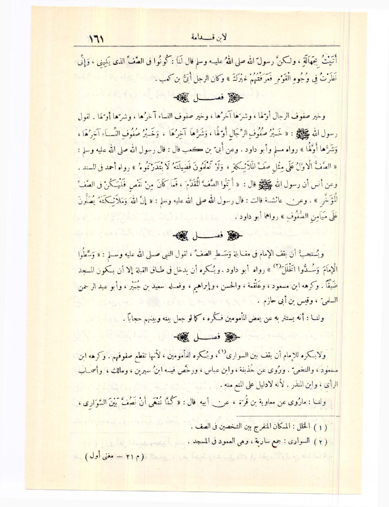 فَصْلٌ: (١١٧٦) وَخَيْرُ صُفُوفِ الرِّجَالِ أَوَّلُهَا، وَشَرُّهَا آخِرُهَا، وَخَيْرُ صُفُوفِ النِّسَاءِ آخِرُهَا، وَشَرُّهَا أَوَّلُهَا؛ لِقَوْلِ رَسُولِ اللَّهِ - صَلَّى اللَّهُ عَلَيْهِ وَسَلَّمَ -: «خَيْرُ صُفُوفِ الرِّجَالِ أَوَّلُهَا، وَشَرُّهَا آخِرُهَا، وَخَيْرُ صُفُوفِ النِّسَاءِ آخِرُهَا، وَشَرُّهَا أَوَّلُهَا» . رَوَاهُ مُسْلِمٌ، وَأَبُو دَاوُد. وَعَنْ أُبَيِّ بْنِ كَعْبٍ، قَالَ: قَالَ رَسُولُ اللَّهِ - صَلَّى اللَّهُ عَلَيْهِ وَسَلَّمَ -: «الصَّفُّ الْأَوَّلُ عَلَى مِثْلِ صَفِّ الْمَلَائِكَةِ، وَلَوْ تَعْلَمُونَ فَضِيلَتَهُ لَابْتَدَرْتُمُوهُ» . رَوَاهُ أَحْمَدُ، فِي " الْمُسْنَدِ ". وَعَنْ أَنَسٍ، أَنَّ رَسُولَ اللَّهِ - صَلَّى اللَّهُ عَلَيْهِ وَسَلَّمَ - قَالَ: «أَتِمُّوا الصَّفَّ الْمُقَدَّمَ، فَمَا كَانَ مِنْ نَقْصٍ فَلْيَكُنْ فِي الصَّفِّ الْمُؤَخَّرِ» . وَعَنْ عَائِشَةَ، قَالَتْ: قَالَ رَسُولُ اللَّهِ - صَلَّى اللَّهُ عَلَيْهِ وَسَلَّمَ -: «إنَّ اللَّهَ وَمَلَائِكَتَهُ يُصَلُّونَ عَلَى مَيَامِنِ الصُّفُوفِ» . رَوَاهُمَا أَبُو دَاوُد.