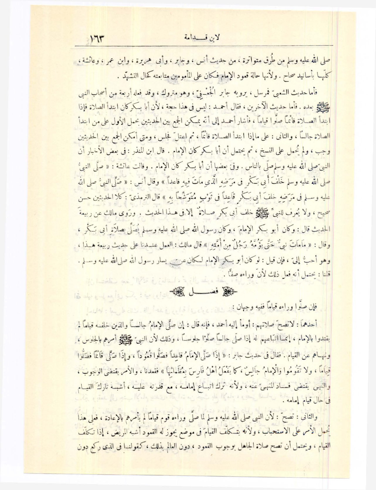 فَإِنْ قِيلَ: لَوْ كَانَ أَبُو بَكْرٍ الْإِمَامَ لَكَانَ عَنْ يَسَارِ رَسُولِ اللَّهِ - صَلَّى اللَّهُ عَلَيْهِ وَسَلَّمَ - قُلْنَا: يَحْتَمِلُ أَنَّهُ فَعَلَ ذَلِكَ؛ لِأَنَّ وَرَاءَهُ صَفًّا. (١١٨٠) فَصْلٌ: فَإِنْ صَلَّوْا وَرَاءَهُ قِيَامًا، فَفِيهِ وَجْهَانِ: أَحَدُهُمَا، لَا تَصِحُّ صَلَاتُهُمْ. أَوْمَأَ إلَيْهِ أَحْمَدُ، فَإِنَّهُ قَالَ: إنْ صَلَّى الْإِمَامُ جَالِسًا، وَاَلَّذِينَ خَلْفَهُ قِيَامًا. لَمْ يَقْتَدُوا بِالْإِمَامِ، إنَّمَا اتِّبَاعُهُمْ لَهُ إذَا صَلَّى جَالِسًا صَلَّوْا جُلُوسًا؛ وَذَلِكَ لِأَنَّ النَّبِيَّ - صَلَّى اللَّهُ عَلَيْهِ وَسَلَّمَ - أَمَرَهُمْ بِالْجُلُوسِ، وَنَهَاهُمْ عَنْ الْقِيَامِ، فَقَالَ فِي حَدِيثِ جَابِرٍ: «إذَا صَلَّى الْإِمَامُ قَاعِدًا فَصَلُّوا قُعُودًا، وَإِذَا صَلَّى قَائِمًا فَصَلُّوا قِيَامًا، وَلَا تَقُومُوا وَالْإِمَامُ جَالِسٌ، كَمَا يَفْعَلُ أَهْلُ فَارِسَ بِعُظَمَائِهَا. فَقَعَدْنَا» وَالْأَمْرُ يَقْتَضِي الْوُجُوبَ، وَالنَّهْيُ يَقْتَضِي فَسَادَ الْمَنْهِيِّ عَنْهُ.