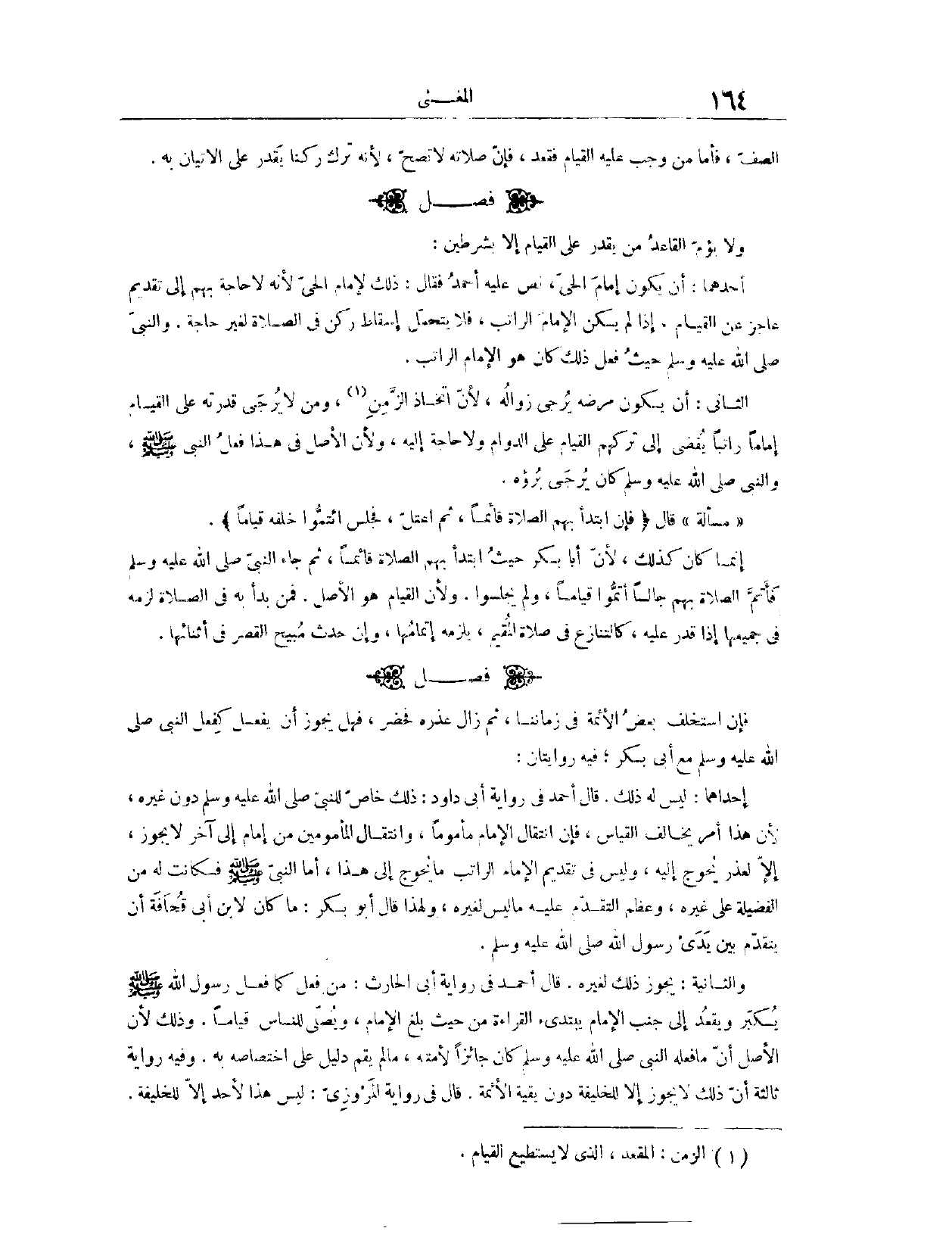 وَلِأَنَّ الْقِيَامَ هُوَ الْأَصْلُ، فَمَنْ بَدَأَ بِهِ فِي الصَّلَاةِ لَزِمَهُ فِي جَمِيعِهَا إذَا قَدَرَ عَلَيْهِ، كَالتَّنَازُعِ فِي صَلَاةِ الْمُقِيمِ يَلْزَمُهُ إتْمَامُهَا، وَإِنْ حَدَثَ مُبِيحُ الْقَصْرِ فِي أَثْنَائِهَا. (١١٨٣) فَصْلٌ: فَإِنْ اسْتَخْلَفَ بَعْضُ الْأَئِمَّةِ فِي زَمَانِنَا، ثُمَّ زَالَ عُذْرُهُ فَحَضَرَ، فَهَلْ يَجُوزُ أَنْ يَفْعَلَ كَفِعْلِ النَّبِيِّ - صَلَّى اللَّهُ عَلَيْهِ وَسَلَّمَ - مَعَ أَبِي بَكْرٍ؟ فِيهِ رِوَايَتَانِ: إحْدَاهُمَا، لَيْسَ لَهُ ذَلِكَ. قَالَ أَحْمَدُ، فِي رِوَايَةِ أَبِي دَاوُد: ذَلِكَ خَاصٌّ لِلنَّبِيِّ - صَلَّى اللَّهُ عَلَيْهِ وَسَلَّمَ - دُونَ غَيْرِهِ؛ لِأَنَّ هَذَا أَمْرٌ يُخَالِفُ الْقِيَاسَ، فَإِنَّ انْتِقَالَ الْإِمَامِ مَأْمُومًا، وَانْتِقَالَ الْمَأْمُومِينَ مِنْ إمَامٍ إلَى آخَرَ، لَا يَجُوزُ إلَّا لِعُذْرٍ يُحْوِجُ إلَيْهِ، وَلَيْسَ فِي تَقْدِيمِ الْإِمَامِ الرَّاتِبِ مَا يُحْوِجُ إلَى هَذَا، أَمَّا النَّبِيُّ - صَلَّى اللَّهُ عَلَيْهِ وَسَلَّمَ - فَكَانَتْ لَهُ مِنْ الْفَضِيلَةِ عَلَى غَيْرِهِ، وَعِظَمِ التَّقَدُّمِ عَلَيْهِ، مَا لَيْسَ لِغَيْرِهِ، وَلِهَذَا قَالَ أَبُو بَكْرٍ: مَا كَانَ لِابْنِ أَبِي قُحَافَةَ أَنْ يَتَقَدَّمَ بَيْنَ يَدَيْ رَسُولِ اللَّهِ - صَلَّى اللَّهُ عَلَيْهِ وَسَلَّمَ -