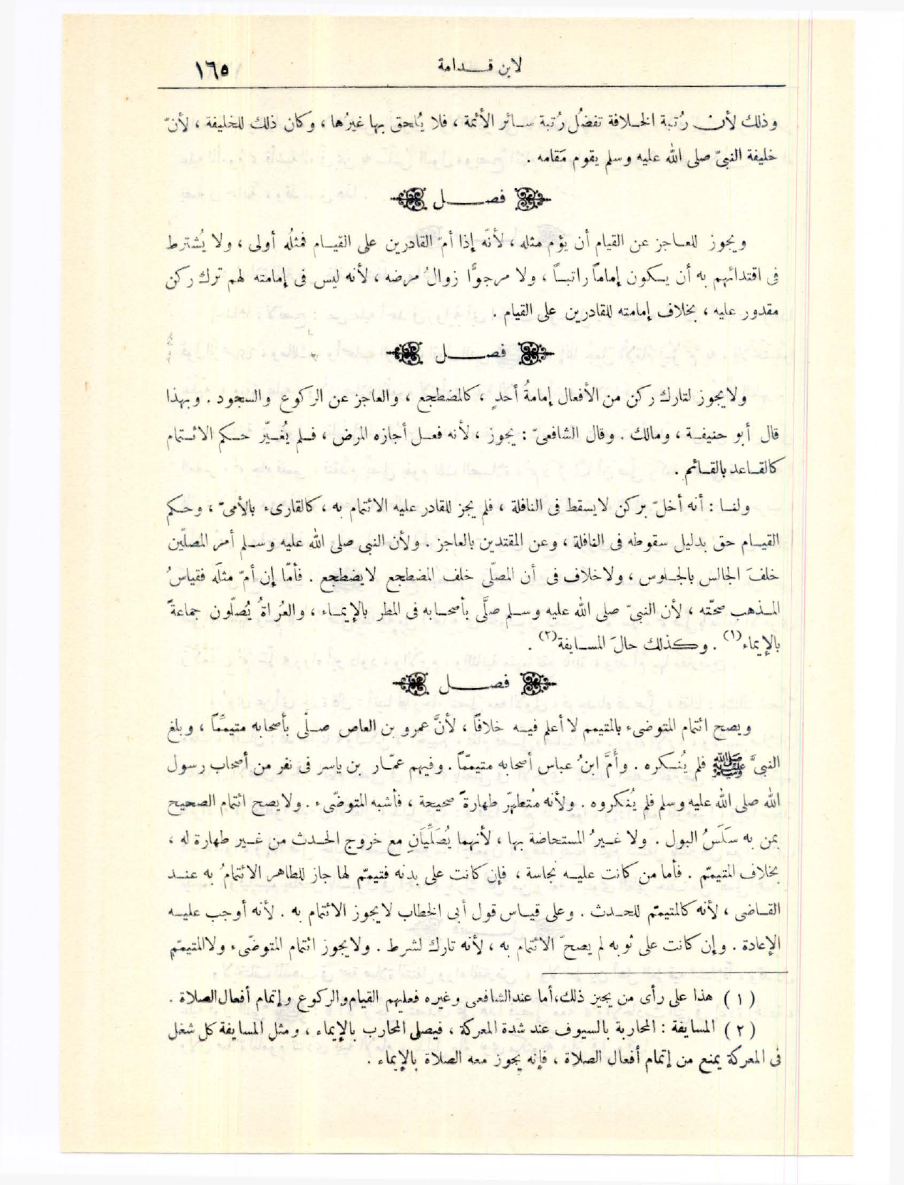 (١١٨٤) فَصْلٌ: وَيَجُوزُ لِلْعَاجِزِ عَنْ الْقِيَامِ أَنْ يَؤُمَّ مِثْلَهُ؛ لِأَنَّهُ إذَا أَمَّ الْقَادِرِينَ عَلَى الْقِيَامِ فَمِثْلُهُ أَوْلَى، وَلَا يُشْتَرَطُ فِي اقْتِدَائِهِمْ بِهِ أَنْ يَكُونَ إمَامًا رَاتِبًا، وَلَا مَرْجُوًّا زَوَالُ مَرَضِهِ؛ لِأَنَّهُ لَيْسَ فِي إمَامَتِهِ لَهُمْ تَرْكُ رُكْنٍ مَقْدُورٍ عَلَيْهِ، بِخِلَافِ إمَامَتِهِ لِلْقَادِرِينَ عَلَى الْقِيَامِ.