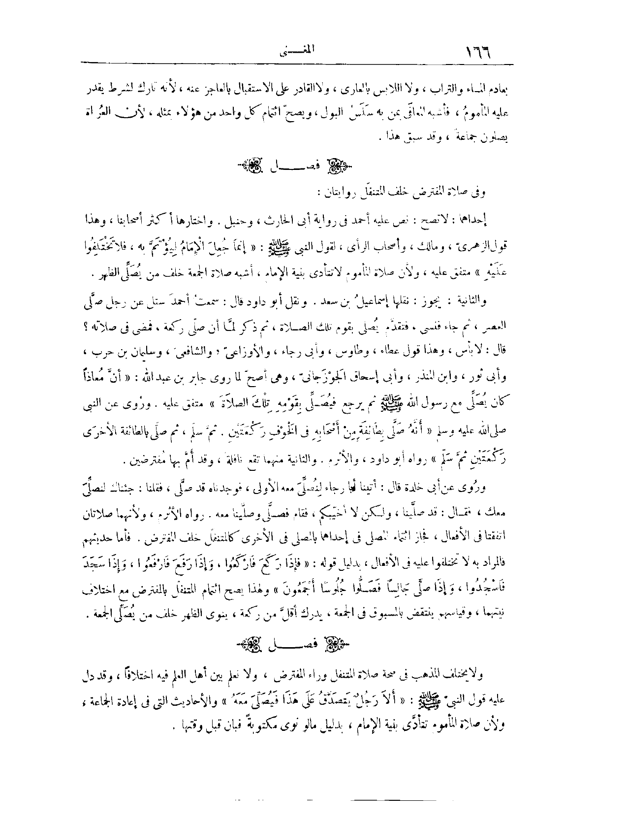 فَصْلٌ: وَلَا يَخْتَلِفُ الْمَذْهَبُ فِي صِحَّةِ صَلَاةِ الْمُتَنَفِّلِ وَرَاءَ الْمُفْتَرِضِ. وَلَا نَعْلَمُ بَيْنَ أَهْلِ الْعِلْمِ فِيهِ اخْتِلَافًا، وَقَدْ دَلَّ عَلَيْهِ قَوْلُ النَّبِيِّ - صَلَّى اللَّهُ عَلَيْهِ وَسَلَّمَ -:: «أَلَا رَجُلٌ يَتَصَدَّقُ عَلَى هَذَا، فَيُصَلِّيَ مَعَهُ» . وَالْأَحَادِيثُ الَّتِي فِي إعَادَةِ الْجَمَاعَةِ، وَلِأَنَّ صَلَاةَ الْمَأْمُومِ تَتَأَدَّى بِنِيَّةِ الْإِمَامِ، بِدَلِيلِ مَا لَوْ نَوَى مَكْتُوبَةً، فَبَانَ قَبْلَ وَقْتِهَا.