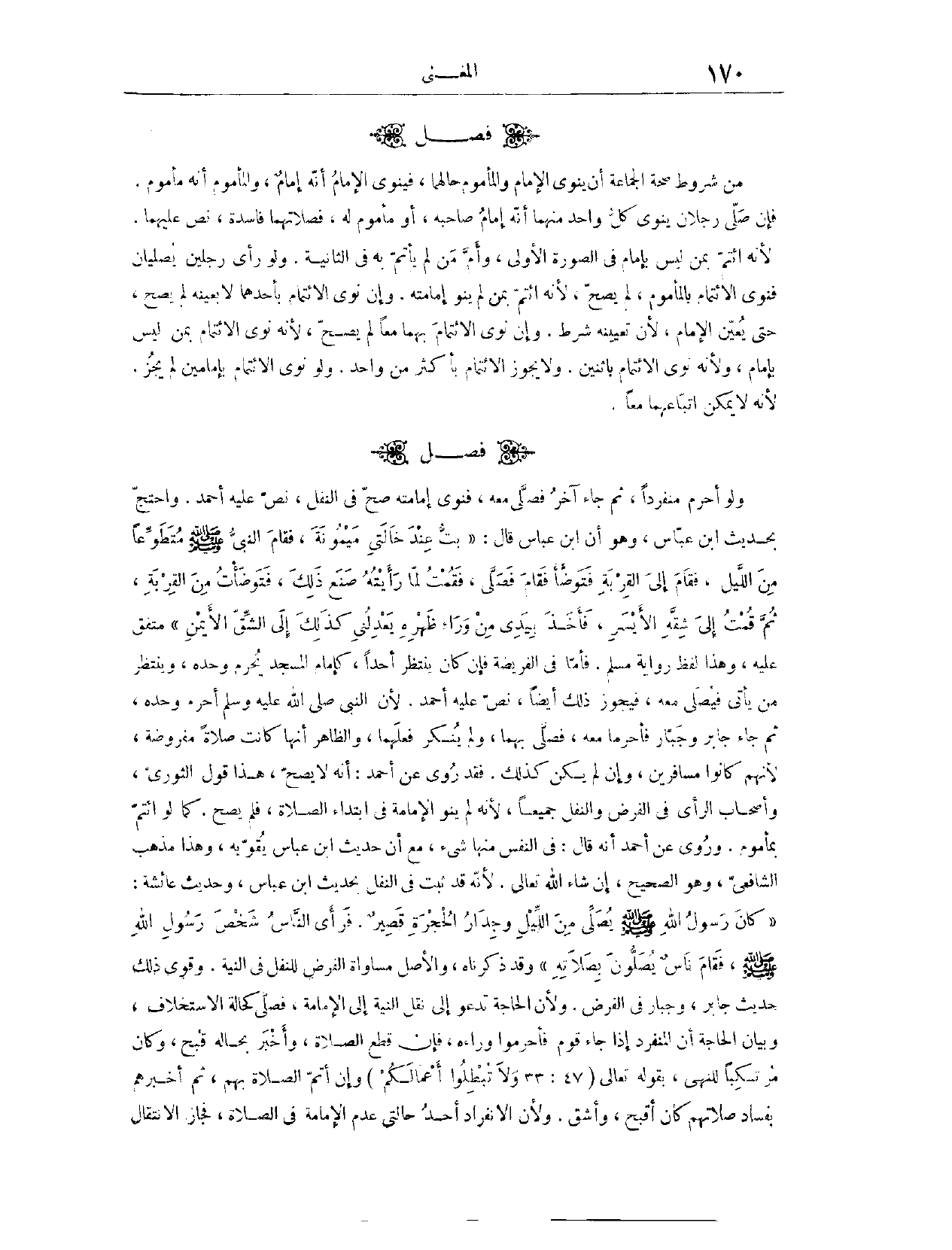 (١١٩٨) فَصْلٌ: مِنْ شَرْطِ صِحَّةِ الْجَمَاعَةِ أَنْ يَنْوِيَ الْإِمَامُ وَالْمَأْمُومُ حَالَهُمَا، فَيَنْوِي الْإِمَامُ أَنَّهُ إمَامٌ، وَالْمَأْمُومُ أَنَّهُ مَأْمُومٌ، فَإِنْ صَلَّى رَجُلَانِ يَنْوِي كُلُّ وَاحِدٍ مِنْهُمَا أَنَّهُ إمَامُ صَاحِبِهِ، أَوْ مَأْمُومٌ لَهُ، فَصَلَاتُهُمَا فَاسِدَةٌ. نُصَّ عَلَيْهِمَا؛ لِأَنَّهُ ائْتَمَّ بِمَنْ لَيْسَ بِإِمَامٍ فِي الصُّورَةِ الْأُولَى، وَأَمَّ مَنْ لَمْ يَأْتَمَّ بِهِ فِي الثَّانِيَةِ. وَلَوْ رَأَى رَجُلَيْنِ يُصَلِّيَانِ، فَنَوَى الِائْتِمَامَ بِالْمَأْمُومِ، لَمْ يَصِحَّ؛ لِأَنَّهُ ائْتَمَّ بِمَنْ لَمْ يَنْوِ إمَامَتَهُ. وَإِنْ نَوَى الِائْتِمَامَ بِأَحَدِهِمَا لَا بِعَيْنِهِ، لَمْ يَصِحَّ، حَتَّى يُعَيِّنَ الْإِمَامَ؛ لِأَنَّ تَعْيِينَهُ شَرْطٌ.