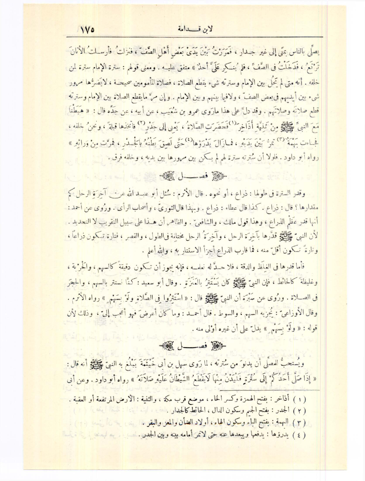 (١٢٠٨) فَصْلٌ: وَيُسْتَحَبُّ لِلْمُصَلِّي أَنْ يَدْنُوَ مِنْ سُتْرَتِهِ؛ لِمَا رَوَى سَهْلُ بْنُ أَبِي حَثْمَةَ، يَبْلُغُ بِهِ النَّبِيَّ - صَلَّى اللَّهُ عَلَيْهِ وَسَلَّمَ - أَنَّهُ قَالَ: «إذَا صَلَّى أَحَدُكُمْ إلَى سُتْرَةٍ، فَلْيَدْنُ مِنْهَا، لَا يَقْطَعُ الشَّيْطَانُ عَلَيْهِ صَلَاتَهُ» . رَوَاهُ أَبُو دَاوُد. وَعَنْ أَبِي