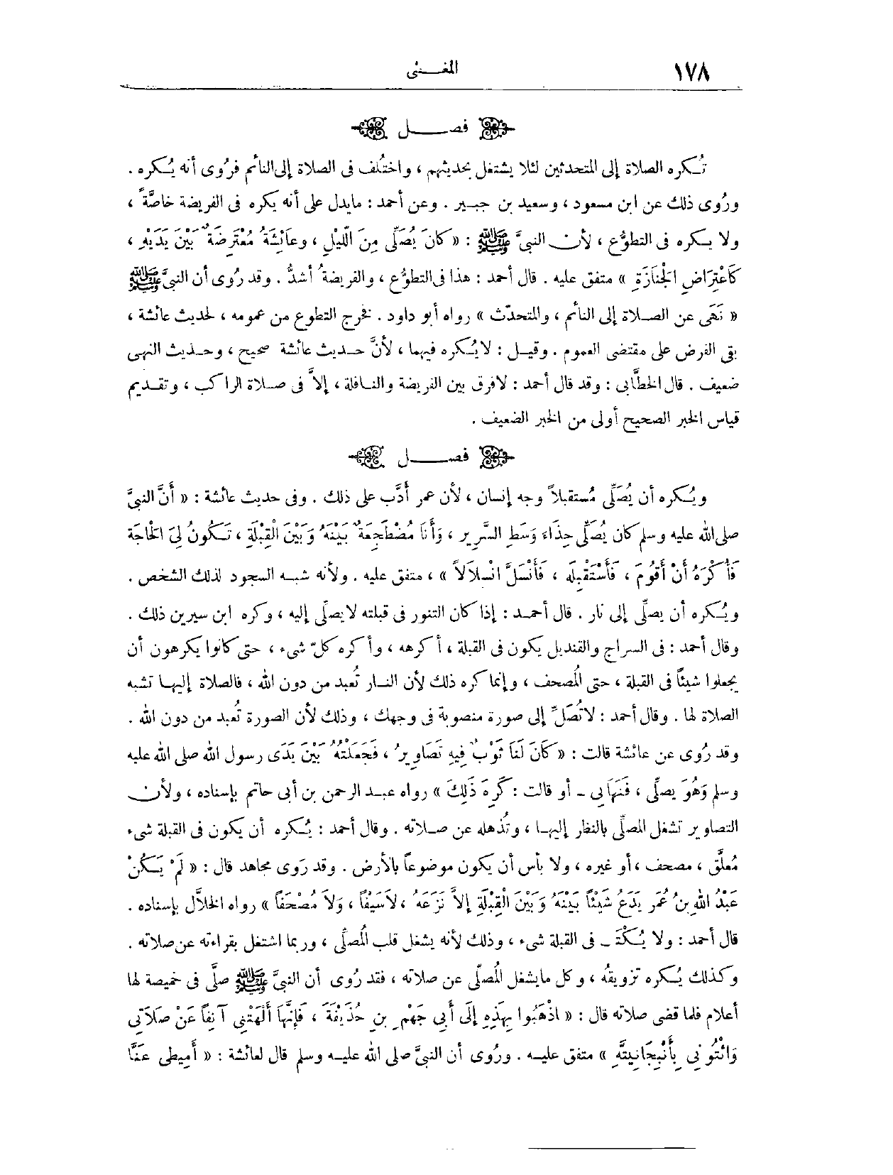 (١٢١٤) فَصْلٌ: تُكْرَهُ الصَّلَاةُ إلَى الْمُتَحَدِّثِينَ، لِئَلَّا يَشْتَغِلَ بِحَدِيثِهِمْ. وَاخْتُلِفَ فِي الصَّلَاةِ إلَى النَّائِمِ، فَرُوِيَ أَنَّهُ يُكْرَهُ، وَرُوِيَ ذَلِكَ عَنْ ابْنِ مَسْعُودٍ، وَسَعِيدِ بْنِ جُبَيْرٍ. وَعَنْ أَحْمَدَ مَا يَدُلُّ عَلَى أَنَّهُ يُكْرَهُ فِي الْفَرِيضَةِ خَاصَّةً، وَلَا يُكْرَهُ فِي التَّطَوُّعِ؛ لِأَنَّ النَّبِيَّ - صَلَّى اللَّهُ عَلَيْهِ وَسَلَّمَ - كَانَ يُصَلِّي مِنْ اللَّيْلِ وَعَائِشَةُ مُعْتَرِضَةٌ بَيْنَ يَدَيْهِ كَاعْتِرَاضِ الْجِنَازَةِ. مُتَّفَقٌ عَلَيْهِ. قَالَ أَحْمَدُ: هَذَا فِي التَّطَوُّعِ، وَالْفَرِيضَةُ أَشَدُّ.
