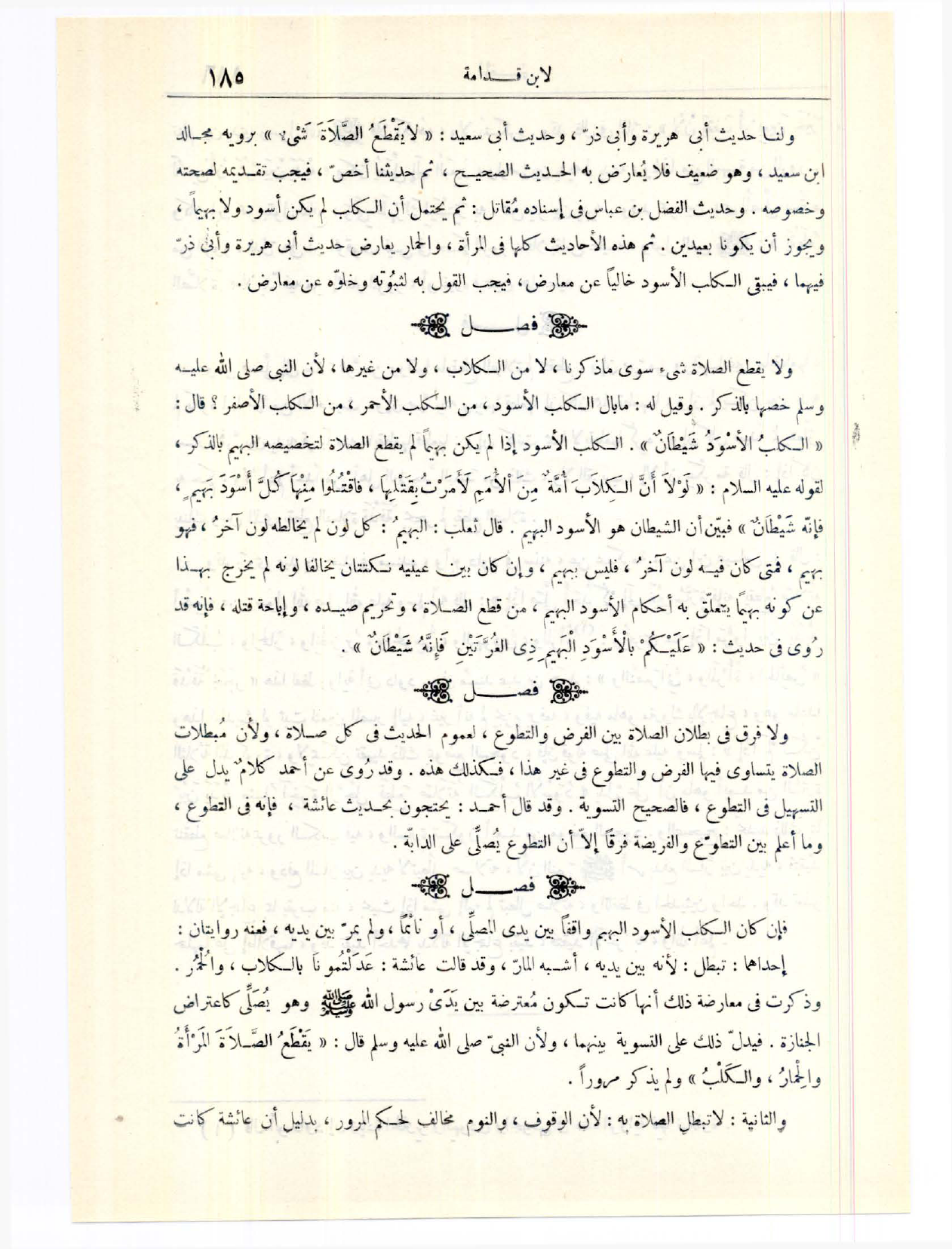 ثُمَّ يَحْتَمِلُ أَنَّ الْكَلْبَ لَمْ يَكُنْ أَسْوَدَ وَلَا بَهِيمًا، وَيَجُوزُ أَنْ يَكُونَا بَعِيدَيْنِ، ثُمَّ هَذِهِ الْأَحَادِيثُ كُلُّهَا فِي الْمَرْأَةِ، وَالْحِمَارِ، يُعَارِضُ حَدِيثَ أَبِي هُرَيْرَةَ وَأَبِي ذَرٍّ فِيهِمَا، فَيَبْقَى الْكَلْبُ الْأَسْوَدُ خَالِيًا عَنْ مُعَارِضٍ، فَيَجِبُ الْقَوْلُ بِهِ لِثُبُوتِهِ، وَخُلُوِّهِ عَنْ مُعَارِضٍ (١٢٢٥) فَصْلٌ: وَلَا يَقْطَعُ الصَّلَاةَ شَيْءٌ سِوَى مَا ذَكَرْنَا، لَا مِنْ الْكِلَابِ وَلَا مِنْ غَيْرِهَا؛ لِأَنَّ النَّبِيَّ - صَلَّى اللَّهُ عَلَيْهِ وَسَلَّمَ - خَصَّهَا بِالذِّكْرِ.