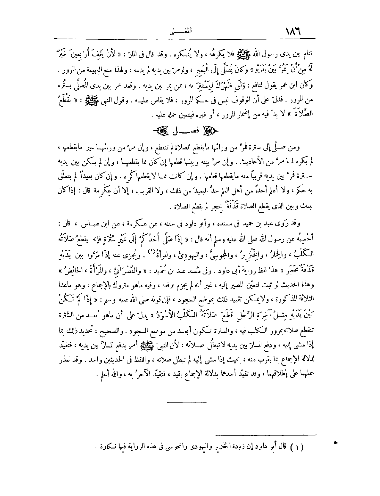(١٢٢٨) فَصْلٌ: وَمَنْ صَلَّى إلَى سُتْرَةٍ فَمَرَّ مِنْ وَرَائِهَا مَا يَقْطَعُ الصَّلَاةَ، لَمْ تَنْقَطِعْ. وَإِنْ مَرَّ مِنْ وَرَائِهَا غَيْرُ مَا يَقْطَعُهَا، لَمْ يُكْرَهْ؛ لِمَا مَرَّ مِنْ الْأَحَادِيثِ. وَإِنْ مَرَّ بَيْنَهُ وَبَيْنَهَا، قَطَعَهَا إنْ كَانَ مِمَّا يَقْطَعُهَا، كُرِهَ إنْ كَانَ مِمَّا لَا يَقْطَعُهَا. وَإِنْ لَمْ يَكُنْ بَيْنَ يَدَيْهِ سُتْرَةٌ، فَمَرَّ بَيْنَ يَدَيْهِ قَرِيبًا مِنْهُ مَا يَقْطَعُهَا، قَطَعَهَا، وَإِنْ كَانَ مِمَّا لَا يَقْطَعُهَا، كُرِهَ، وَإِنْ كَانَ بَعِيدًا، لَمْ يَتَعَلَّقْ بِهِ حُكْمٌ.