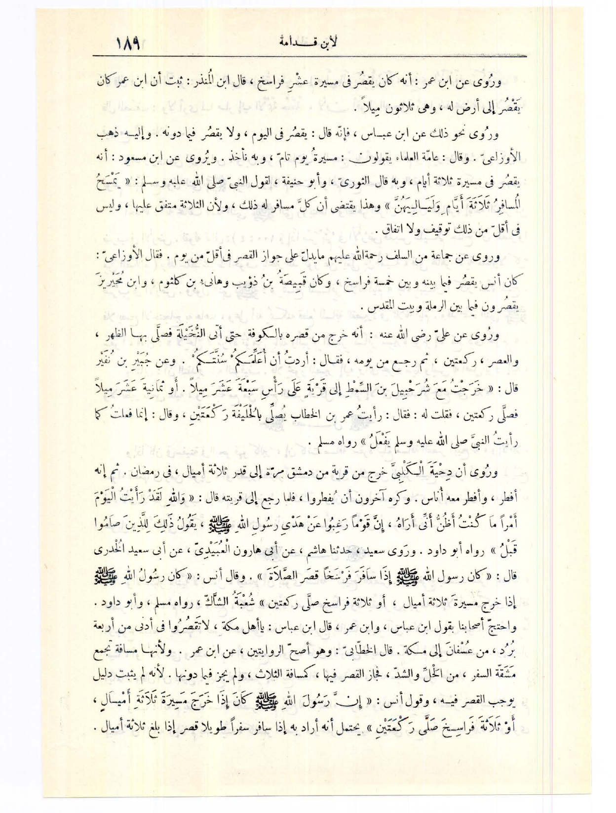 وَهَذَا يَقْتَضِي أَنَّ كُلَّ مُسَافِرٍ لَهُ ذَلِكَ، وَلِأَنَّ الثَّلَاثَةَ مُتَّفَقٌ عَلَيْهَا، وَلَيْسَ فِي أَقَلِّ مِنْ ذَلِكَ تَوْقِيفٌ وَلَا اتِّفَاقٌ. وَرُوِيَ عَنْ جَمَاعَةٍ مِنْ السَّلَفِ، رَحْمَةُ اللَّهِ عَلَيْهِمْ، مَا يَدُلُّ عَلَى جَوَازِ الْقَصْرِ فِي أَقَلَّ مِنْ يَوْمٍ، فَقَالَ الْأَوْزَاعِيُّ: كَانَ أَنَسٌ يَقْصُرُ فِيمَا بَيْنَهُ وَبَيْنَ خَمْسَةِ فَرَاسِخَ. وَكَانَ قَبِيصَةُ بْنُ ذُؤَيْبٍ، وَهَانِئُ بْنُ كُلْثُومٍ، وَابْنُ مُحَيْرِيزٍ يَقْصُرُونَ فِيمَا بَيْنَ الرَّمْلَةِ وَبَيْتِ الْمَقْدِسِ.