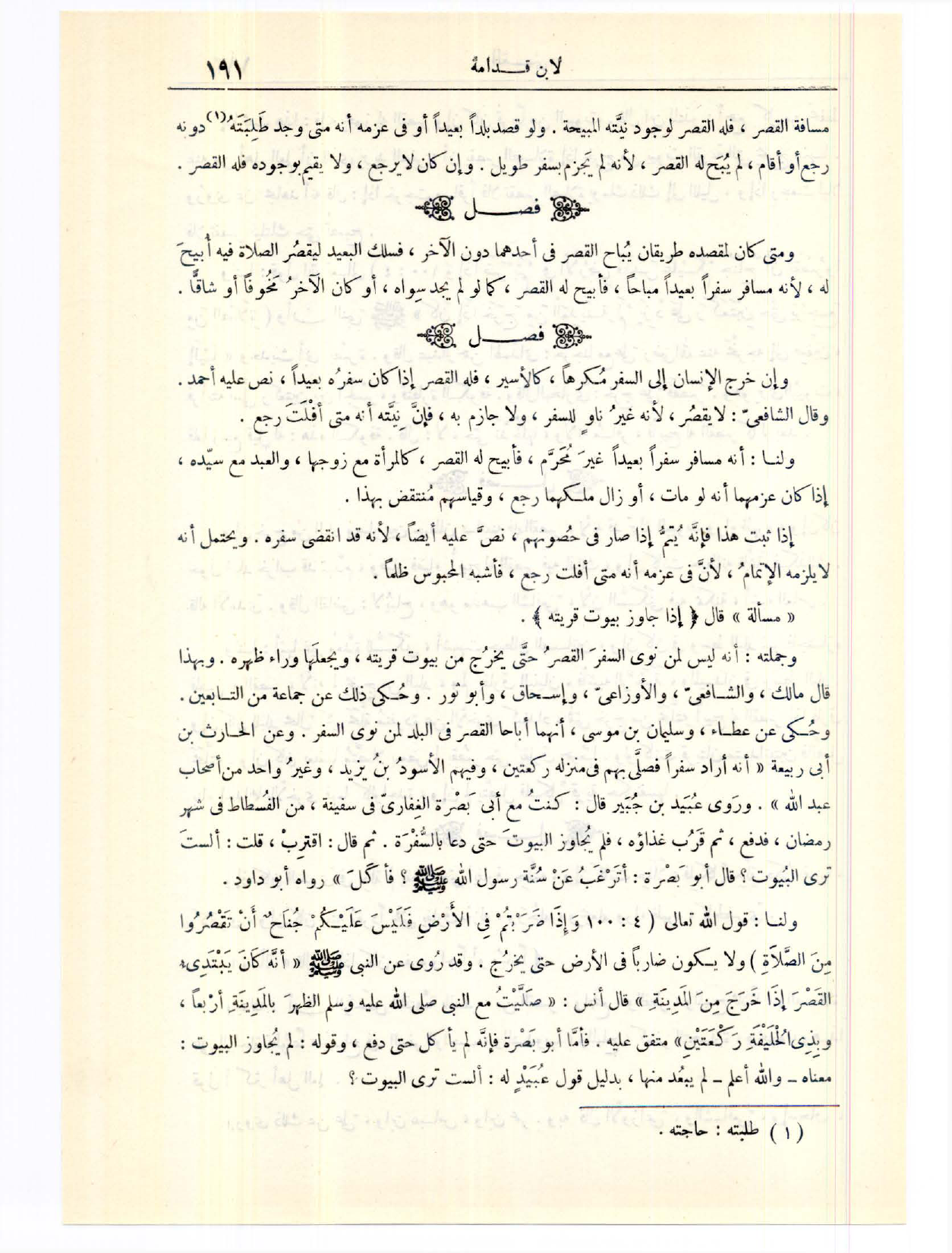 [مَسْأَلَةٌ لَيْسَ لِمَنْ نَوَى السَّفَرَ الْقَصْرُ حَتَّى يَخْرُج مِنْ بُيُوت قَرْيَتِهِ]
