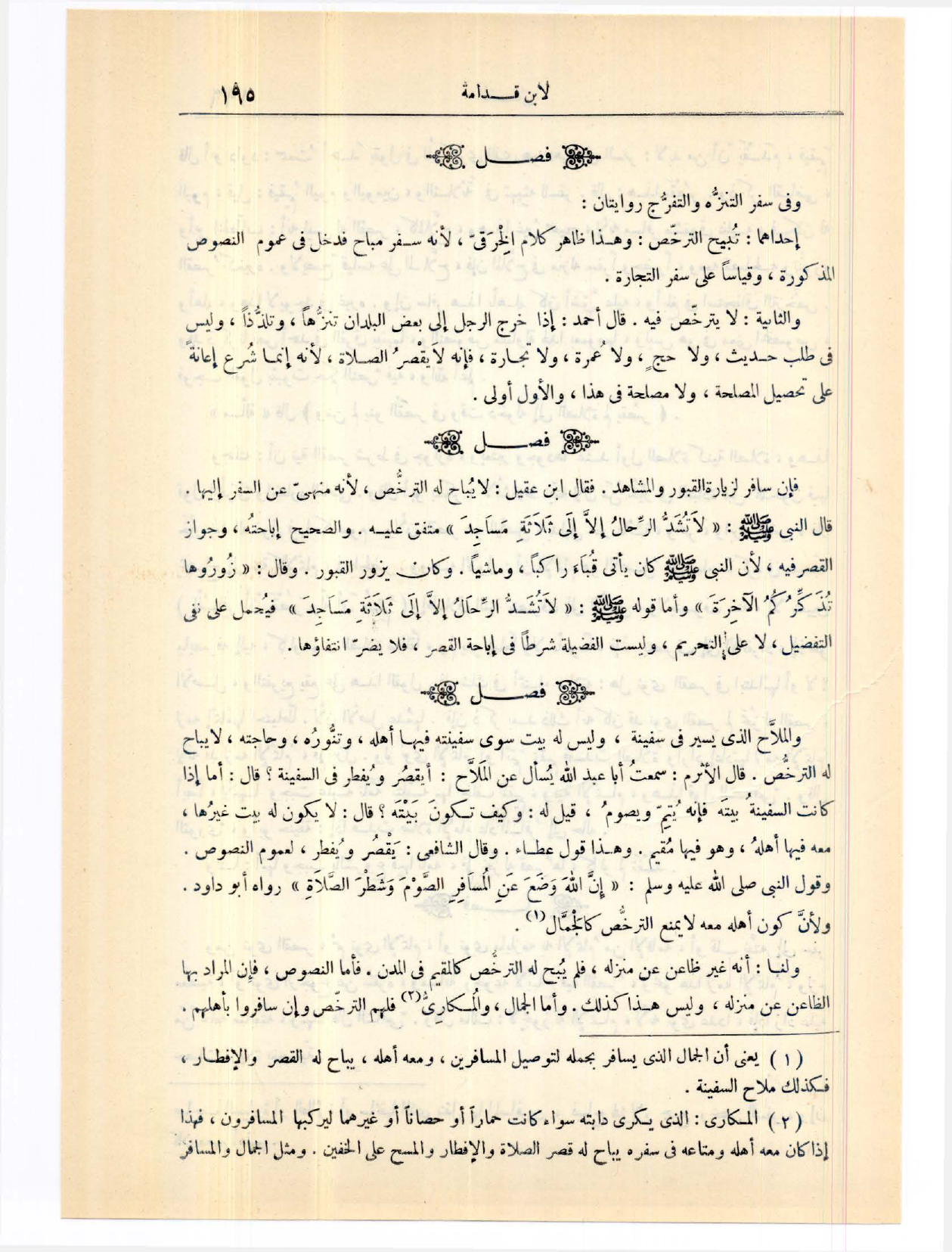 (١٢٤٢) فَصْلٌ: وَفِي سَفَرِ التَّنَزُّهِ وَالتَّفَرُّجِ رِوَايَتَانِ: إحْدَاهُمَا، تُبِيحُ التَّرَخُّصَ. وَهَذَا ظَاهِرُ كَلَامِ الْخِرَقِيِّ لِأَنَّهُ سَفَرٌ مُبَاحٌ، فَدَخَلَ فِي عُمُومِ النُّصُوصِ الْمَذْكُورَةِ، وَقِيَاسًا عَلَى سَفَرِ التِّجَارَةِ. وَالثَّانِيَةُ: لَا يَتَرَخَّصُ فِيهِ. قَالَ أَحْمَدُ: إذَا خَرَجَ الرَّجُلُ إلَى بَعْضِ الْبُلْدَانِ تَنَزُّهًا وَتَلَذُّذًا، وَلَيْسَ فِي طَلَبِ حَدِيثٍ وَلَا حَجٍّ وَلَا عُمْرَةٍ وَلَا تِجَارَةٍ، فَإِنَّهُ لَا يَقْصُرُ الصَّلَاةَ؛ لِأَنَّهُ إنَّمَا شُرِعَ إعَانَةً عَلَى تَحْصِيلِ الْمَصْلَحَةِ، وَلَا مَصْلَحَةَ فِي هَذَا.