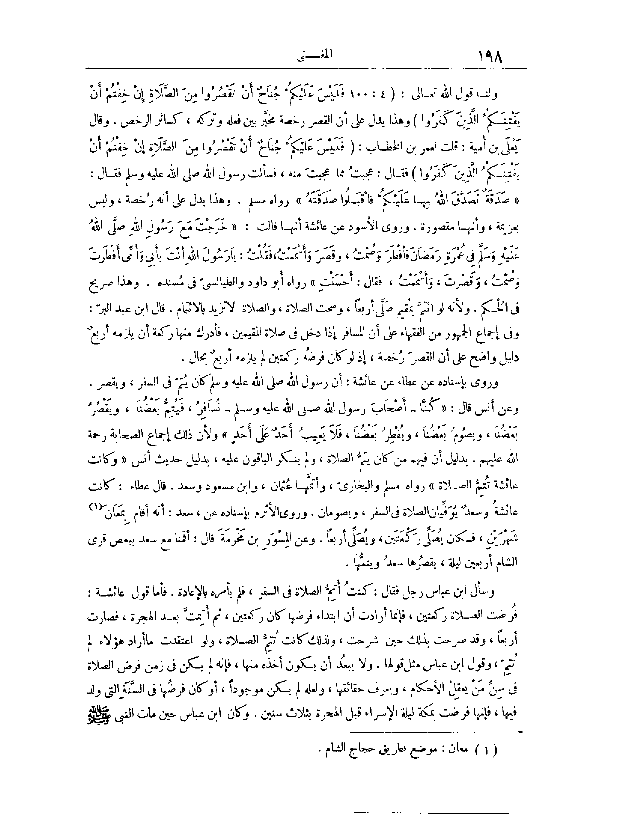 وَأَتَمَّهَا عُثْمَانُ، وَابْنُ مَسْعُودٍ، وَسَعْدٌ. وَقَالَ عَطَاءٌ: كَانَتْ عَائِشَةُ وَسَعْدٌ يُوفِيَانِ الصَّلَاةَ فِي السَّفَرِ، وَيَصُومَانِ، وَرَوَى الْأَثْرَمُ بِإِسْنَادِهِ، عَنْ سَعْدٍ، أَنَّهُ أَقَامَ بِعَمَّانَ شَهْرَيْنِ، فَكَانَ يُصَلِّي رَكْعَتَيْنِ، وَيُصَلِّي أَرْبَعًا. وَعَنْ الْمِسْوَرِ بْنِ مَخْرَمَةَ، قَالَ: أَقَمْنَا مَعَ سَعْدٍ بِبَعْضِ قُرَى الشَّامِ أَرْبَعِينَ لَيْلَةً يَقْصُرُهَا سَعْدٌ وَنُتِمُّهَا. وَسَأَلَ ابْنَ عَبَّاسٍ رَجُلٌ، فَقَالَ: كُنْت أُتِمُّ الصَّلَاةَ فِي السَّفَرِ. فَلَمْ يَأْمُرْهُ بِالْإِعَادَةِ.