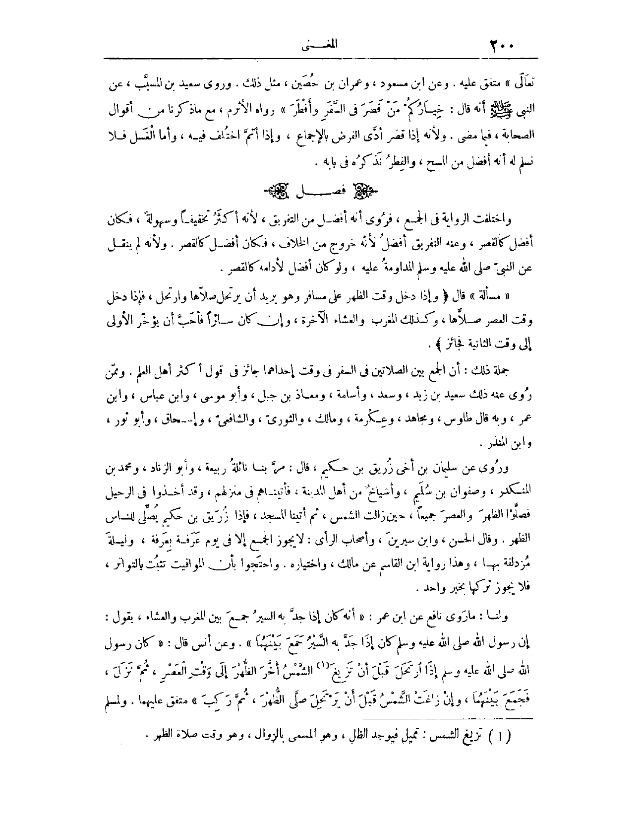 (١٢٥٢) مَسْأَلَةٌ؛ قَالَ: (وَإِذَا دَخَلَ وَقْتُ الظُّهْرِ عَلَى مُسَافِرٍ، وَهُوَ يُرِيدُ أَنْ يَرْتَحِلَ، صَلَّاهَا وَارْتَحَلَ، فَإِذَا دَخَلَ وَقْتُ الْعَصْرِ صَلَّاهَا، وَكَذَلِكَ الْمَغْرِبُ وَالْعِشَاءُ الْآخِرَةُ، وَإِنْ كَانَ سَائِرًا فَأَحَبَّ أَنْ يُؤَخِّرَ الْأُولَى إلَى وَقْتِ الثَّانِيَةِ فَجَائِزٌ) . جُمْلَةُ ذَلِكَ أَنَّ الْجَمْعَ بَيْنَ الصَّلَاتَيْنِ فِي السَّفَرِ، فِي وَقْتِ إحْدَاهُمَا، جَائِزٌ فِي قَوْلِ أَكْثَرِ أَهْلِ الْعِلْمِ.