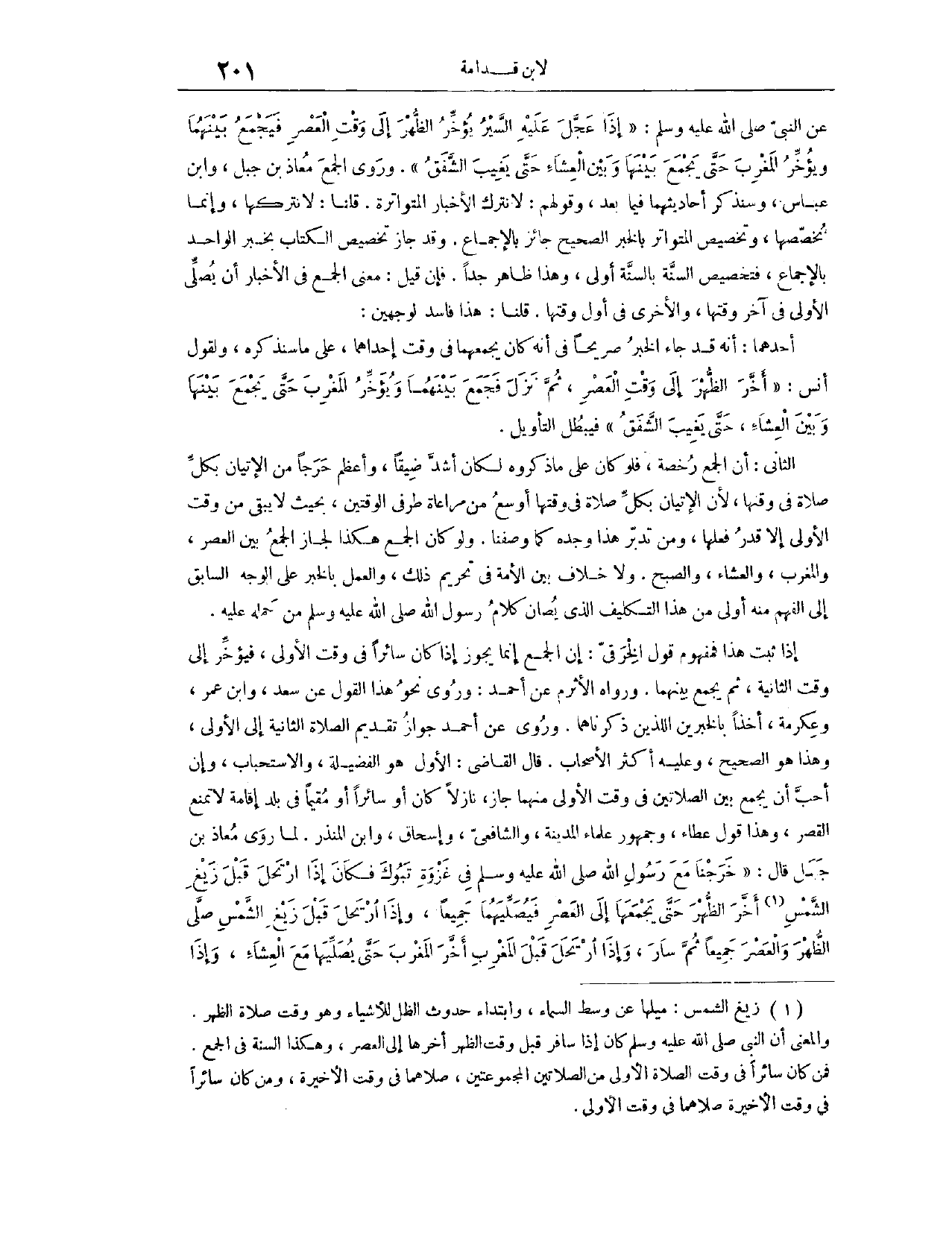 فَإِنْ قِيلَ: مَعْنَى الْجَمْعِ فِي الْأَخْبَارِ أَنْ يُصَلِّيَ الْأُولَى فِي آخِرِ وَقْتِهَا، وَالْأُخْرَى فِي أَوَّلِ وَقْتِهَا. قُلْنَا: هَذَا فَاسِدٌ لِوَجْهَيْنِ: أَحَدُهُمَا، أَنَّهُ قَدْ جَاءَ الْخَبَرُ صَرِيحًا فِي أَنَّهُ كَانَ يَجْمَعُهُمَا فِي وَقْتِ إحْدَاهُمَا، عَلَى مَا سَنَذْكُرُهُ، وَلِقَوْلِ أَنَسٌ: أَخَّرَ الظُّهْرَ إلَى وَقْتِ الْعَصْرِ، ثُمَّ نَزَلَ فَجَمَعَ بَيْنَهُمَا، وَيُؤَخِّرُ الْمَغْرِبَ حَتَّى يَجْمَعَ بَيْنهَا وَبَيْنَ الْعِشَاءِ حِين يَغِيبَ الشَّفَقُ. فَيَبْطُلُ التَّأْوِيلُ.