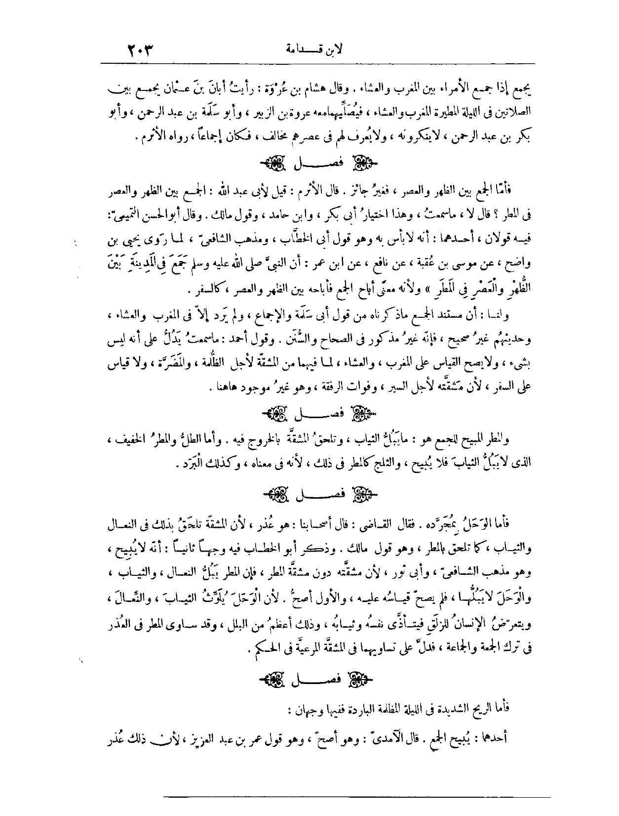 يَجْمَعُ إذَا جَمَعَ الْأُمَرَاءُ بَيْنَ الْمَغْرِبِ وَالْعِشَاءِ. وَقَالَ هِشَامُ بْنُ عُرْوَةَ: رَأَيْتُ أَبَانَ بْنَ عُثْمَانَ يَجْمَعُ بَيْنَ الصَّلَاتَيْنِ فِي اللَّيْلَةِ الْمَطِيرَةِ؛ الْمَغْرِبِ وَالْعِشَاءِ، فَيُصَلِّيَهُمَا مَعَهُ عُرْوَةُ بْنُ الزُّبَيْرِ،، وَأَبُو سَلَمَةَ بْنُ عَبْدِ الرَّحْمَنِ، وَأَبُو بَكْرِ بْنُ عَبْدِ الرَّحْمَنِ، لَا يُنْكِرُونَهُ. وَلَا يُعْرَفُ لَهُمْ فِي عَصْرِهِمْ مُخَالِفٌ، فَكَانَ إجْمَاعًا. رَوَاهُ الْأَثْرَمُ (١٢٥٥) فَصْلٌ: فَأَمَّا الْجَمْعُ بَيْنَ الظُّهْرِ وَالْعَصْرِ، فَغَيْرُ جَائِزٍ. قَالَ: الْأَثْرَمُ: قِيلَ لِأَبِي عَبْدِ اللَّهِ: الْجَمْعُ بَيْنَ الظُّهْرِ وَالْعَصْرِ فِي الْمَطَرِ؟ قَالَ: لَا، مَا سَمِعْت. وَهَذَا (اخْتِيَارُ) أَبِي بَكْرٍ، وَابْنِ حَامِدٍ، وَقَوْلُ مَالِكٍ. وَقَالَ أَبُو الْحَسَنِ التَّمِيمِيُّ: فِيهِ (قَوْلَانِ،) أَحَدُهُمَا أَنَّهُ لَا بَأْسَ بِهِ. وَهُوَ قَوْلُ أَبِي الْخَطَّابِ، (وَمَذْهَبُ) الشَّافِعِيِّ، لِمَا رَوَى يَحْيَى بْنُ وَاضِحٍ، عَنْ مُوسَى بْنُ عُقْبَةَ، عَنْ نَافِعٍ عَنْ ابْنِ عُمَرَ، «أَنَّ النَّبِيَّ - صَلَّى اللَّهُ عَلَيْهِ وَسَلَّمَ - جَمَعَ فِي الْمَدِينَةِ بَيْنَ الظُّهْرِ وَالْعَصْرِ فِي الْمَطَرِ» . وَلِأَنَّهُ (مَعْنًى) أَبَاحَ الْجَمْعَ، فَأَبَاحَهُ بَيْنَ الظُّهْرِ وَالْعَصْرِ، كَالسَّفَرِ. وَلَنَا، أَنَّ مُسْتَنَدَ الْجَمْعِ مَا ذَكَرْنَاهُ مِنْ قَوْلِ (أَبِي سَلَمَةَ) ، وَالْإِجْمَاعِ، وَلَمْ يَرِدْ إلَّا فِي الْمَغْرِبِ وَالْعِشَاءِ، وَحَدِيثُهُمْ غَيْرُ صَحِيحٍ؛ فَإِنَّهُ غَيْرُ مَذْكُورٍ فِي الصِّحَاحِ وَالسُّنَنِ. وَقَوْلُ أَحْمَدَ: مَا سَمِعْتُ. يَدُلُّ عَلَى أَنَّهُ لَيْسَ بِشَيْءٍ، وَلَا يَصِحُّ الْقِيَاسُ عَلَى الْمَغْرِبِ وَالْعِشَاءِ؛ لِمَا فِيهِمَا مِنْ الْمَشَقَّةِ لِأَجْلِ الظُّلْمَةِ وَالْمَضَرَّةِ، وَلَا الْقِيَاسُ عَلَى السَّفَرِ؛ لِأَنَّ مَشَقَّتَهُ لِأَجْلِ السَّيْرِ وَفَوَاتِ الرُّفْقَةِ، وَهُوَ غَيْرُ مَوْجُودٍ هَاهُنَا.
