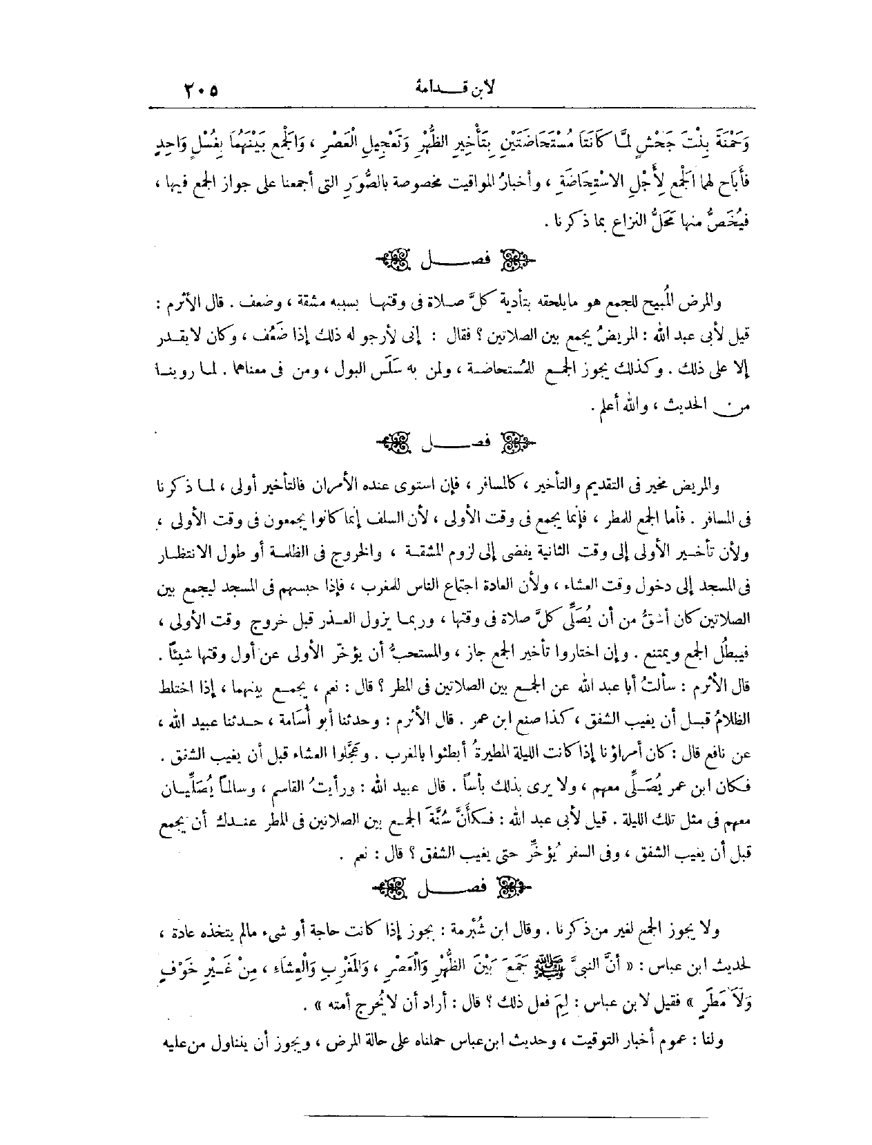 (١٢٦١) فَصْلٌ: وَالْمَرَضُ الْمُبِيحُ لِلْجَمْعِ هُوَ مَا يَلْحَقهُ بِهِ بِتَأْدِيَةِ كُلِّ صَلَاةٍ فِي وَقْتِهَا مَشَقَّةٌ وَضَعْفٌ. قَالَ الْأَثْرَمُ، قِيلَ لِأَبِي عَبْدِ اللَّهِ: الْمَرِيضُ يَجْمَعُ بَيْنَ الصَّلَاتَيْنِ؟ فَقَالَ: إنِّي لِأَرْجُوَ لَهُ ذَلِكَ إذَا ضَعُفَ، وَكَانَ لَا يَقْدِرُ إلَّا عَلَى ذَلِكَ. وَكَذَلِكَ يَجُوزُ الْجَمْعُ لِلْمُسْتَحَاضَةِ، وَلِمَنْ بِهِ سَلَسُ الْبَوْلِ، وَمَنْ فِي مَعْنَاهُمَا؛ لِمَا رَوَيْنَا مِنْ الْحَدِيثِ، وَاَللَّهُ أَعْلَمُ.