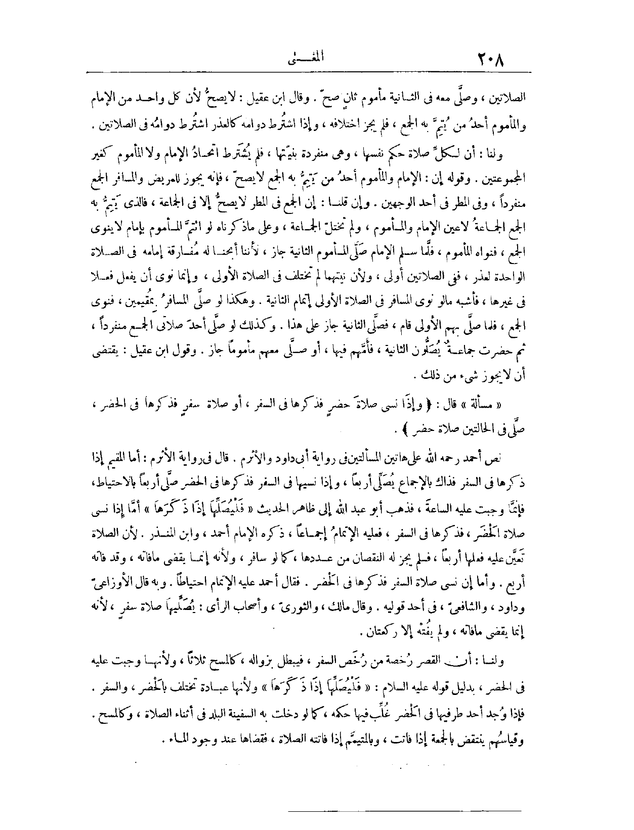 وَلَنَا، أَنَّ لِكُلِّ صَلَاةٍ حُكْمَ نَفْسِهَا، وَهِيَ مُنْفَرِدَةٌ بِنِيَّتِهَا، فَلَمْ يُشْتَرَطْ اتِّحَادُ الْإِمَامِ وَلَا الْمَأْمُومِ، كَغَيْرِ الْمَجْمُوعَتَيْنِ. وَقَوْلُهُ: إنَّ الْإِمَامَ وَالْمَأْمُومَ أَحَدُ مَنْ يَتِمُّ بِهِ الْجَمْعُ. لَا يَصِحُّ، فَإِنَّهُ يَجُوزُ لِلْمَرِيضِ وَالْمُسَافِرِ الْجَمْعُ مُنْفَرِدًا وَفِي الْمَطَرِ فِي أَحَدِ الْوَجْهَيْنِ. وَإِنْ قُلْنَا: إنَّ الْجَمْعَ فِي الْمَطَرِ لَا يَصِحُّ إلَّا فِي الْجَمَاعَةِ. فَاَلَّذِي يَتِمُّ بِهِ الْجَمْعُ الْجَمَاعَةُ، لَا عَيْنُ الْإِمَامِ وَالْمَأْمُومِ، وَلَمْ تَخْتَلَّ الْجَمَاعَةُ، وَعَلَى مَا ذَكَرْنَاهُ، لَوْ ائْتَمَّ الْمَأْمُومُ بِإِمَامٍ لَا يَنْوِي الْجَمْعَ، فَنَوَاهُ الْمَأْمُومُ، فَلَمَّا سَلَّمَ الْإِمَامُ صَلَّى الْمَأْمُومُ الثَّانِيَةَ، جَازَ.