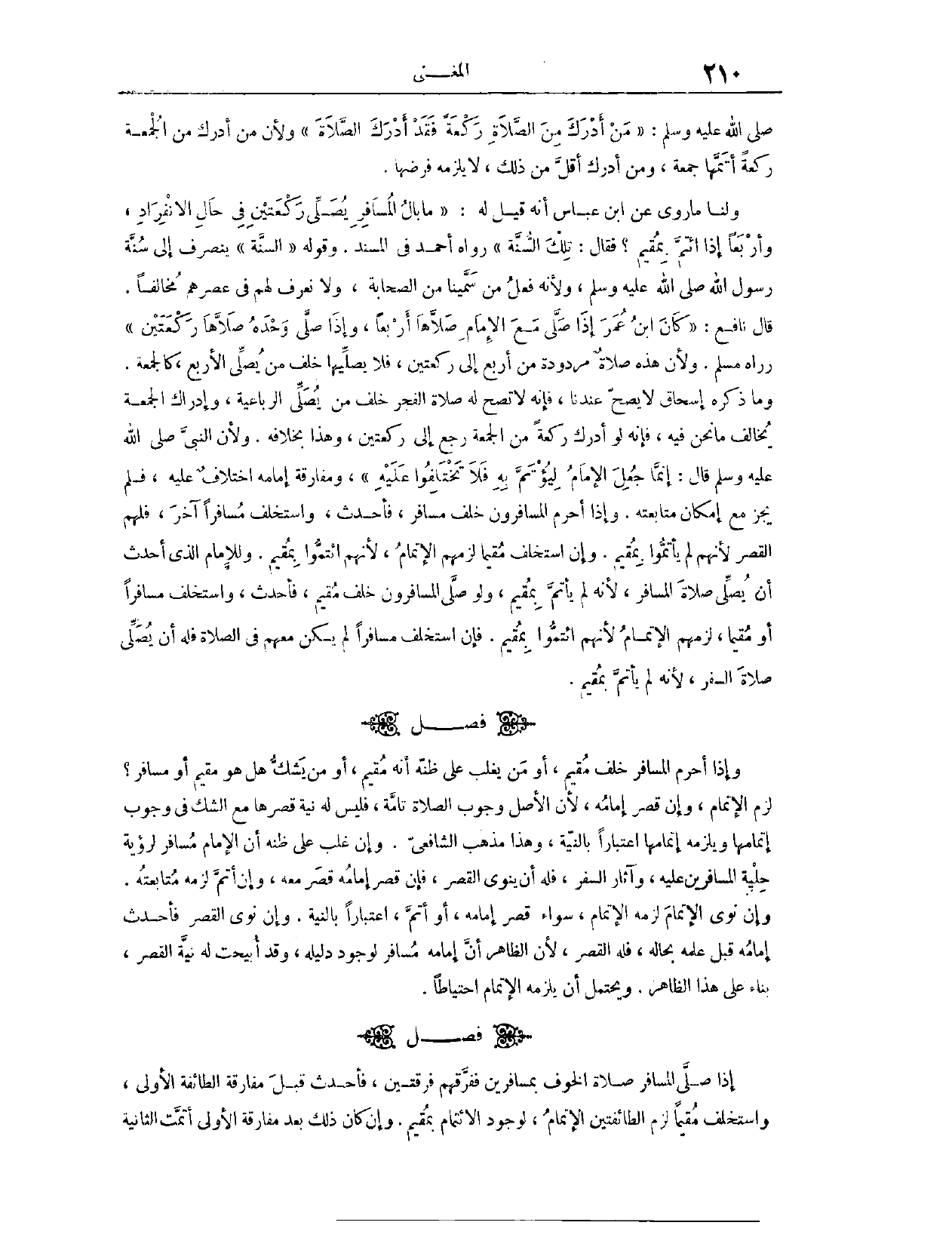 (١٢٧٤) فَصْلٌ: وَإِذَا أَحْرَمَ الْمُسَافِرُ خَلْفَ مُقِيمٍ، أَوْ مَنْ يَغْلِبُ عَلَى ظَنِّهِ أَنَّهُ مُقِيمٌ، أَوْ مَنْ يَشُكُّ هَلْ هُوَ مُقِيمٌ أَوْ مُسَافِرٌ؟ لَزِمَ الْإِتْمَامُ، وَإِنْ قَصَرَ إمَامُهُ؛ لِأَنَّ الْأَصْلَ وُجُوبُ الصَّلَاةِ تَامَّةً، فَلَيْسَ لَهُ نِيَّةُ قَصْرِهَا مَعَ الشَّكِّ فِي وُجُوبِ إتْمَامِهَا، وَيَلْزَمُهُ إتْمَامُهَا اعْتِبَارًا بِالنِّيَّةِ. وَهَذَا مَذْهَبُ الشَّافِعِيِّ.